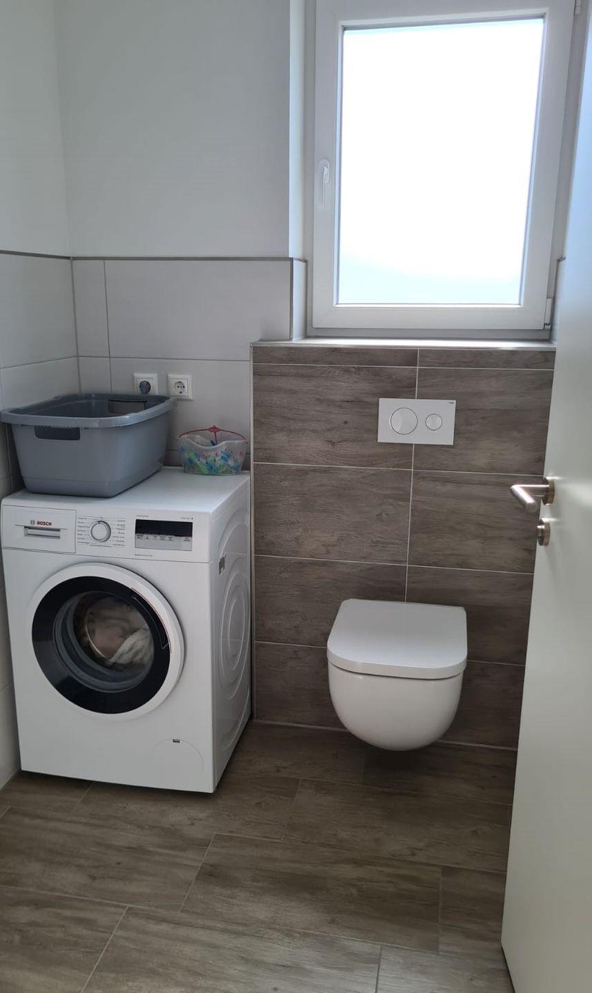 Eine Waschmaschine und ein Wäschetrockner ist im Gästebad zu finden und ermöglicht auch längere Aufenthalte.