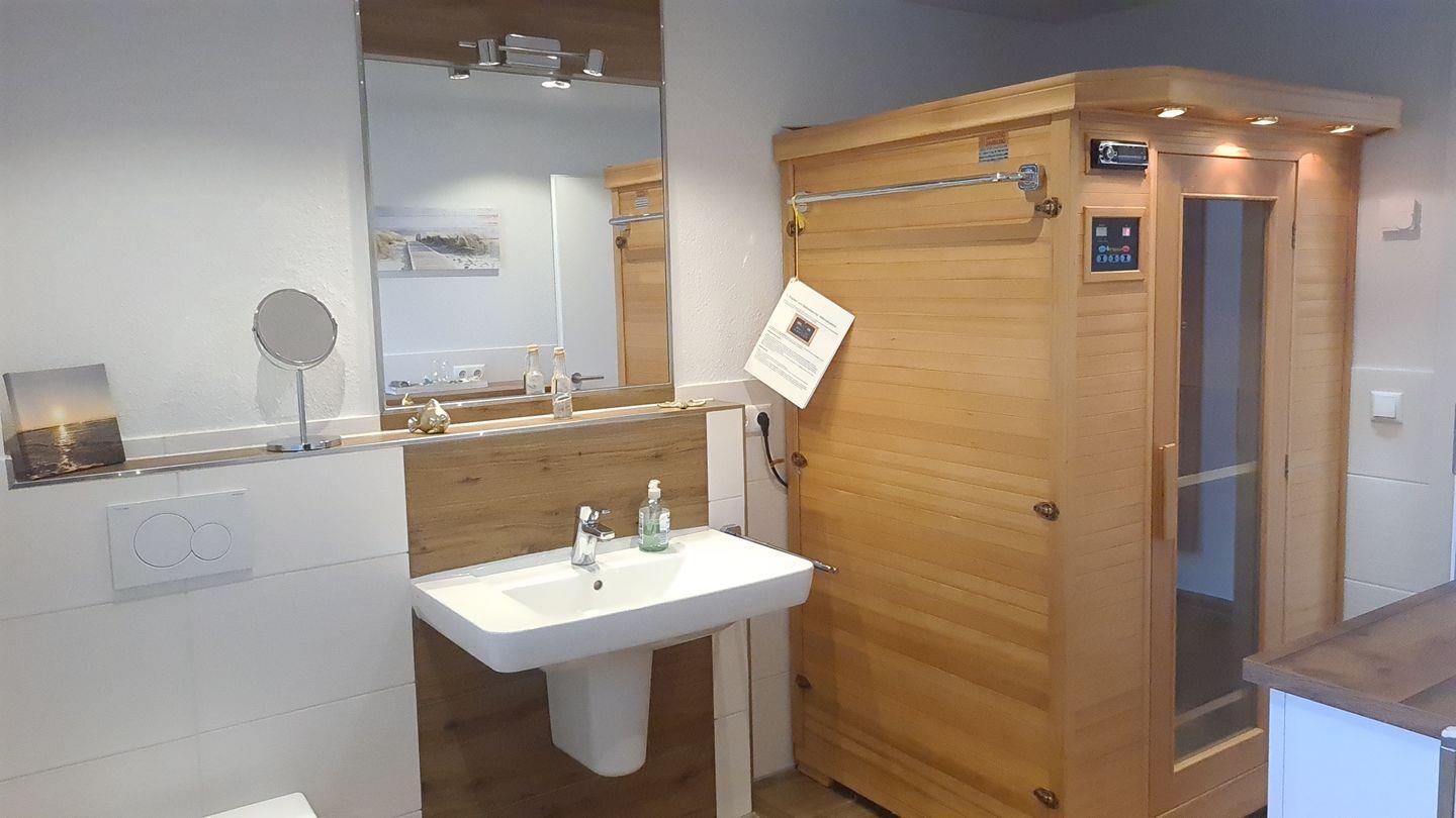 Das luxuriöse Hauptbad verfügt über eine große Walk-In-Dusche und eine entspannende Infrarotsauna, ergänzt durch ein praktisches Gäste-WC.