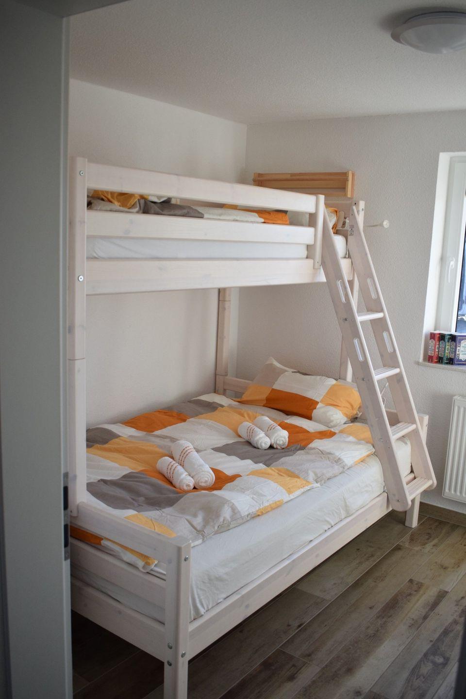 Wir bieten ausreichend Platz für 6 Personen in drei Schlafzimmern, die mit Massivholzmöbeln ausgestattet sind (ein Doppelbett, zwei Familienkojen) und eine große Wohnküche mit umfangreicher, neuwertiger Ausstattung (großer Kühlschrank mit Gefrierfach, Geschirrspüler, Kaffeemaschine, smoothie-Mixer, Toaster, Ceran-Kochfeld mit Backofen) und Esstisch mit 6 Plätzen, darüber hinaus eine gemütliche Sitzgruppe mit Kaminofen und schwenkbarem, großem Satelliten TV.