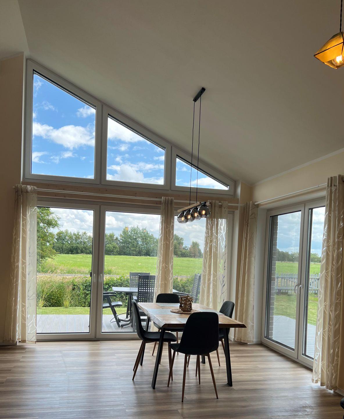 Das Haus bietet auf einer Ebene ca. 83 qm Wohnfläche. Der offene Wohn- und Küchenbereich verfügt über eine hochwertige Ausstattung (Kühlschrank, Gefrierschrank, Geschirrspülmaschine, Backofen, Mikrowelle, Glaskeramik-Kochfeld, Kaffeemaschine, Toaster, Waffeleisen) und einen großen Holztisch für 6 Personen. Gegenüber einer Leder-Sofalandschaft befindet sich ein großer Fernseher mit Satelliten- und Breitband-Internetanschluss.