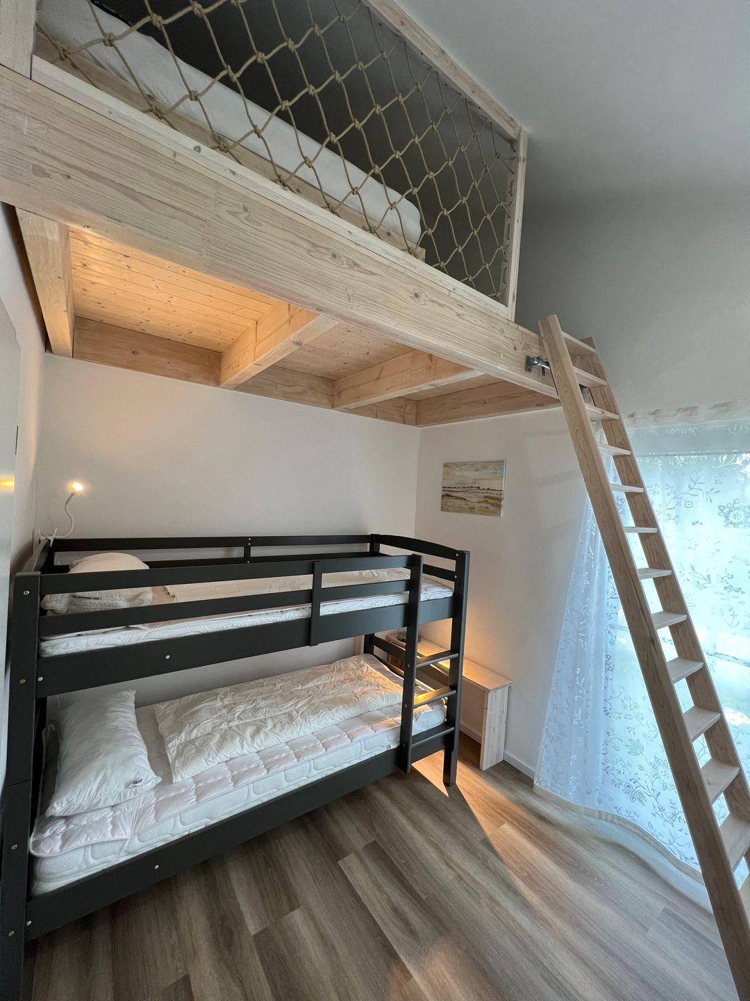 Das zweite Schlafzimmer bietet ein Stockbett (jeweils 200cm x 90cm) und ist auf der Empore (keine Stehhöhe) mit einem weiteren Bett (200cm x 140cm) ausgestattet.