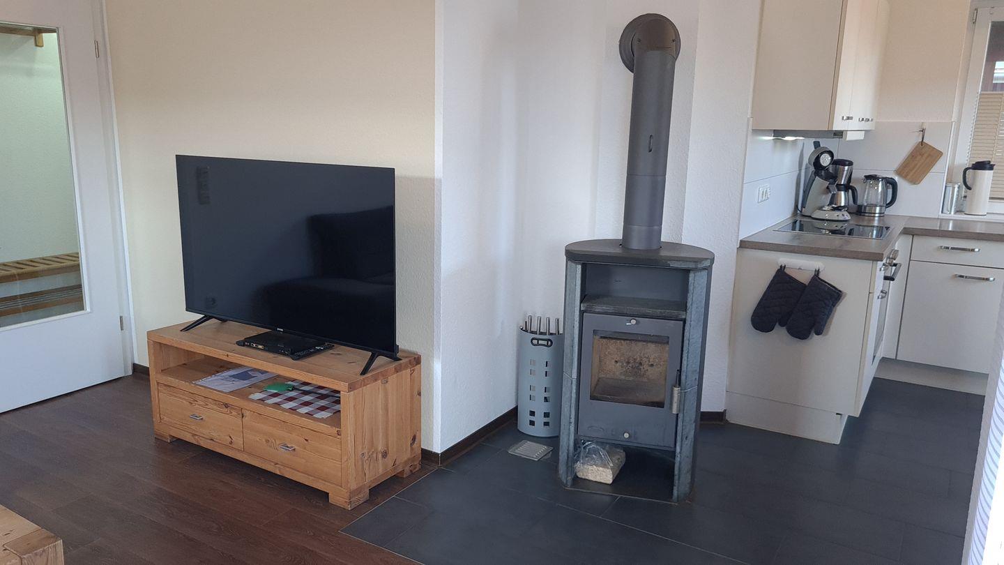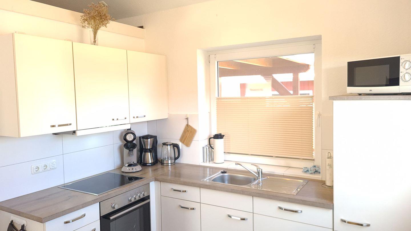 Das geschmackvoll eingerichtete, barrierearme Ferienhaus (ca. 70 m²) empfängt Sie mit einem hellen Flur. Der offene Wohnbereich mit gemütlichem Wohnzimmer (Schlafcouch für 2 Personen), komplett ausgestatteter Küche (Esstisch für 5 Personen, Kinderstuhl) und Kamin lädt zum Verweilen ein. Von hier aus gelangen Sie direkt auf die möblierte Terrasse.