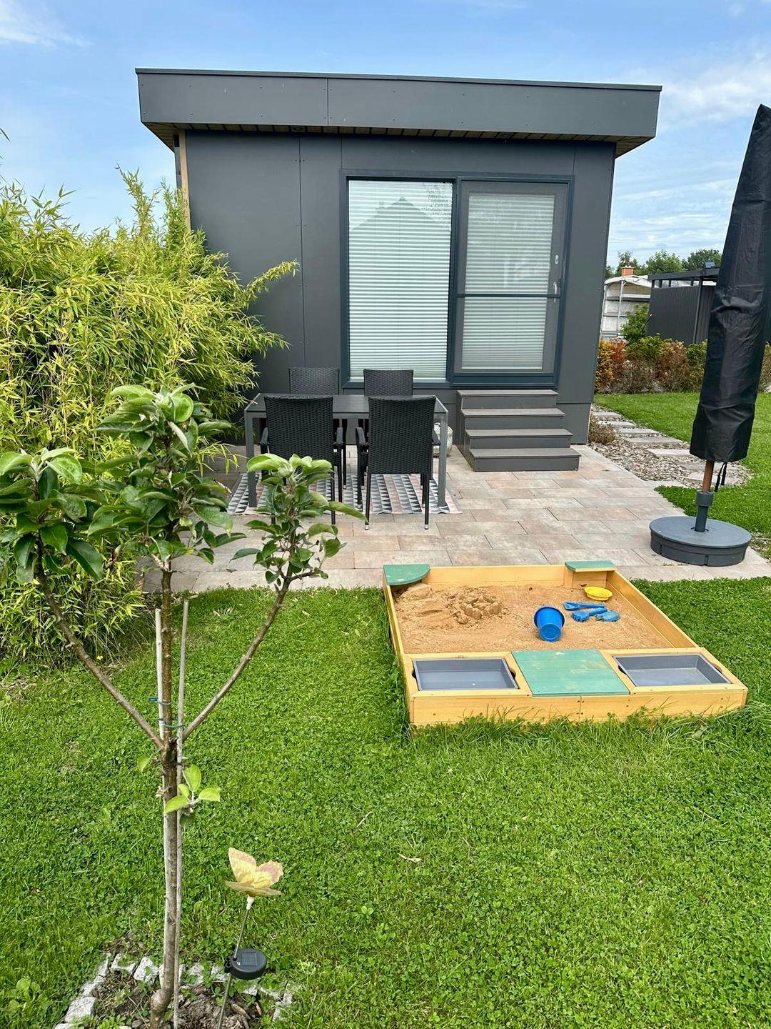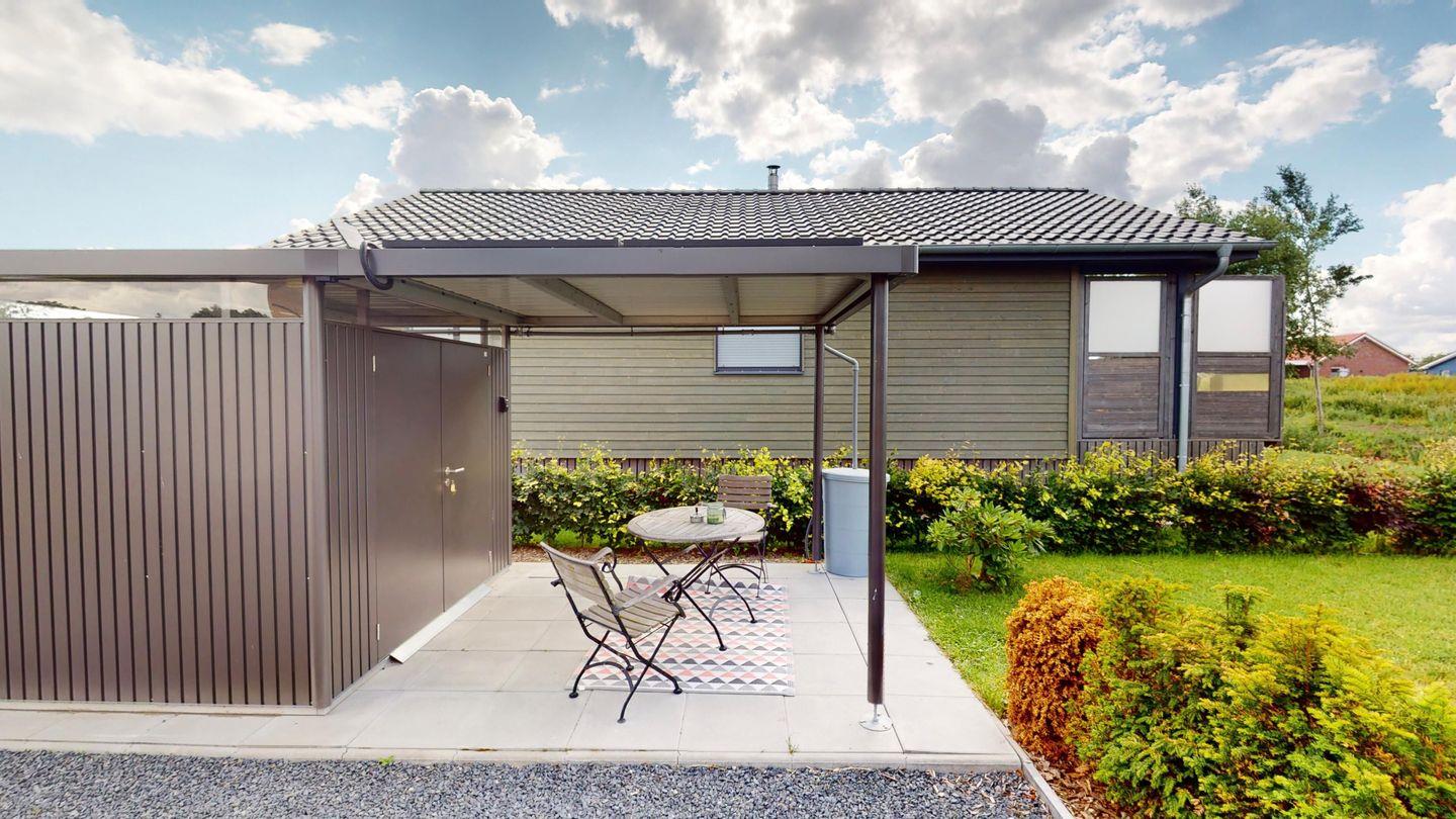 Gartenhaus mit Vordach, unter dem man gemütlich im Schatten sitzen kann (dort dürfen Sie auch gern rauchen, da im Haus das Rauchen nicht gestattet ist).