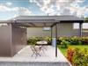 Sonnenterasse mit Sonnenschirm, Gartenmöbeln und einem Holzkohlegrill