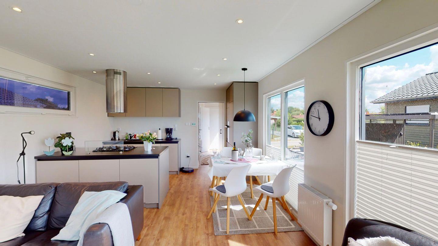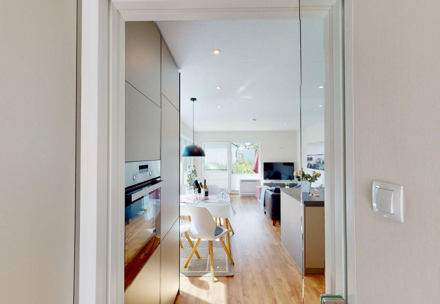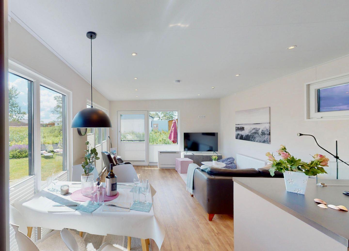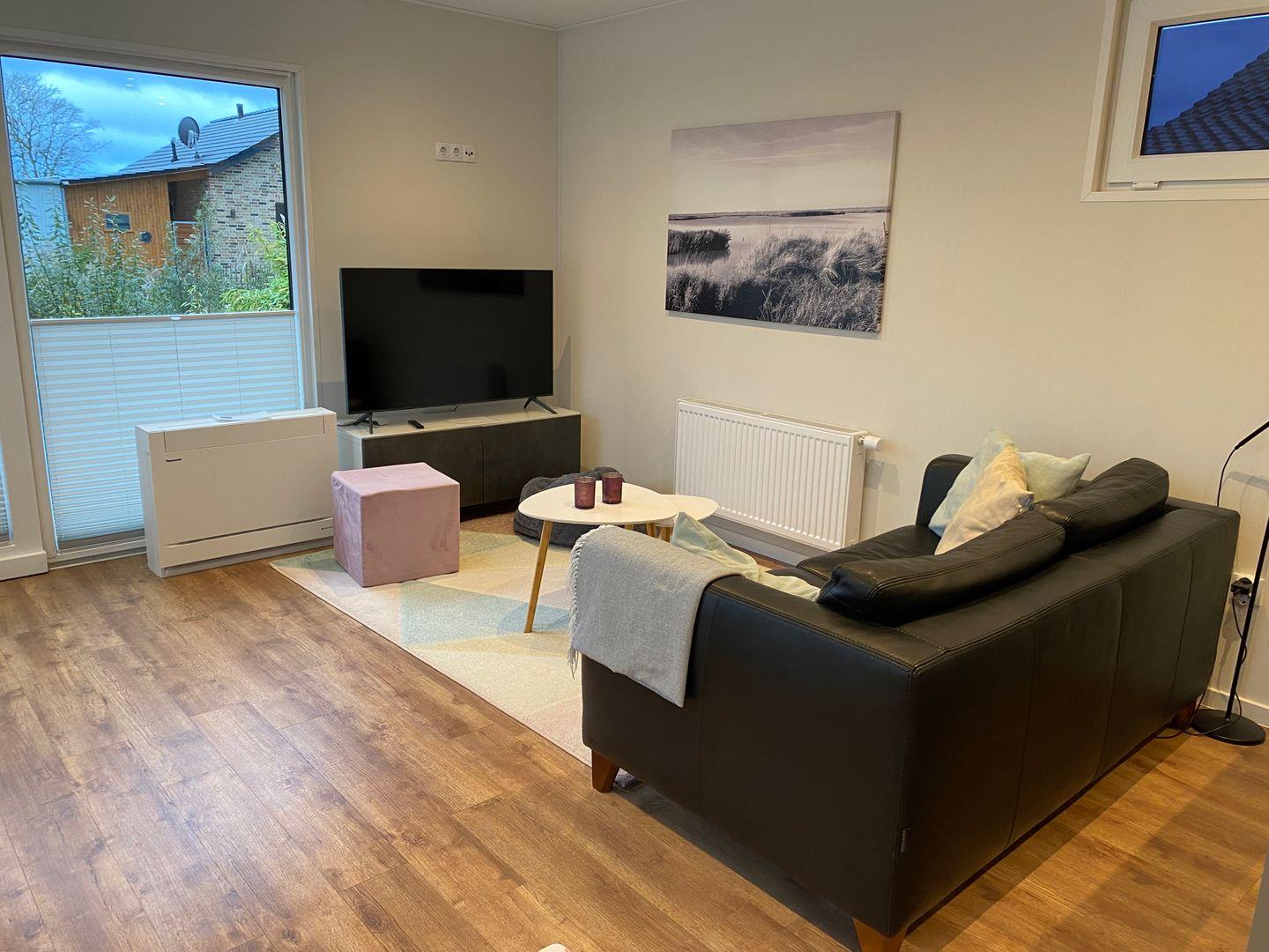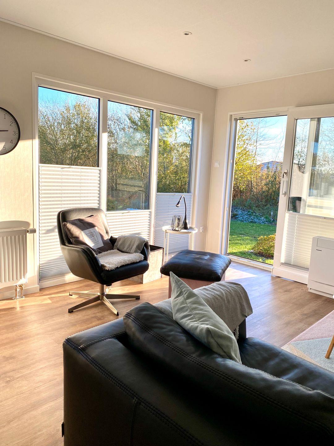 Die MeerAuszeit verwöhnt auf 50 qm mit moderner, allergikerfreundlicher Einrichtung. Große Panoramafenster und die sonnige Terrasse schenken einen herrlichen Blick in den Garten mit Obstbäumen und Kräutern.