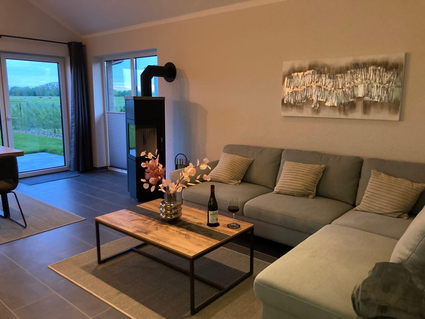 Der großzügige, helle Wohnbereich mit offener Küche lässt keine Wünsche offen. Ob vom bequemen Sofa aus, oder direkt vom Essbereich, sie genießen jederzeit den freien Blick in die offene Landschaft der Wesermarsch. Wenn die Sonne einmal nicht scheinen sollte vermittelt der Kamin viel Wärme und Gemütlichkeit.
