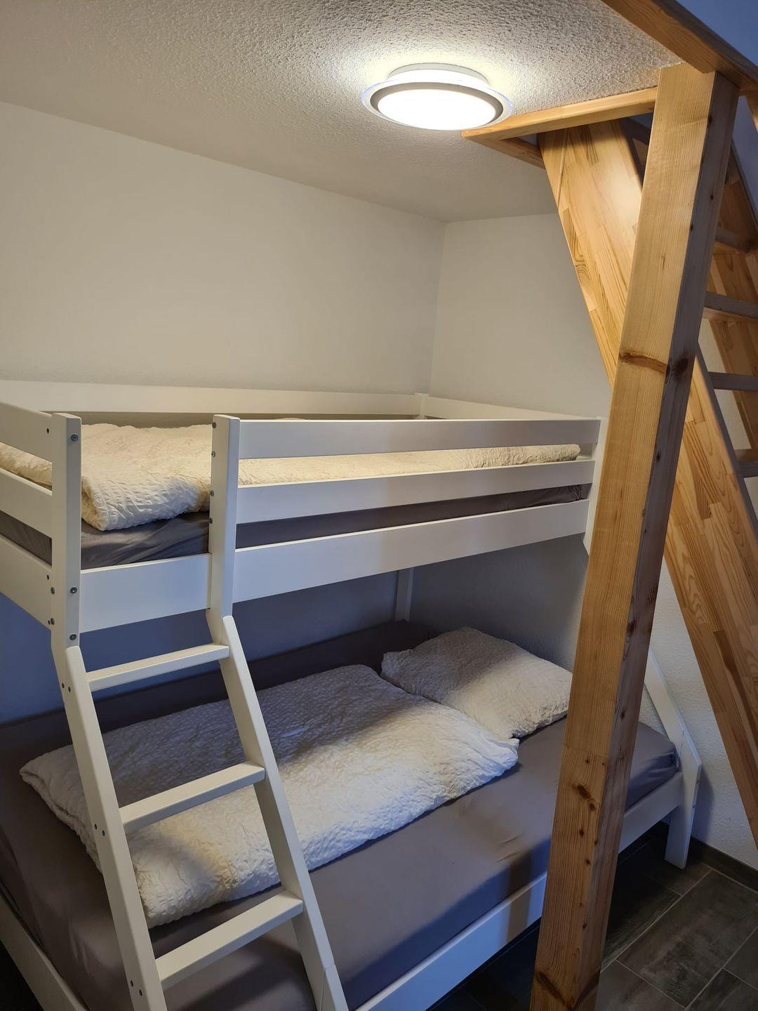 Das Hauptschlafzimmer verfügt über ein Doppelbett (180x 200). Das zweite Schlafzimmer ist mit einem Etagenbett (140X200 und 90X200) ausgestattet. Die zusätzliche Spielebene ist vom 2 Schlafzimmer über eine Raumspartreppe zu erreichen.