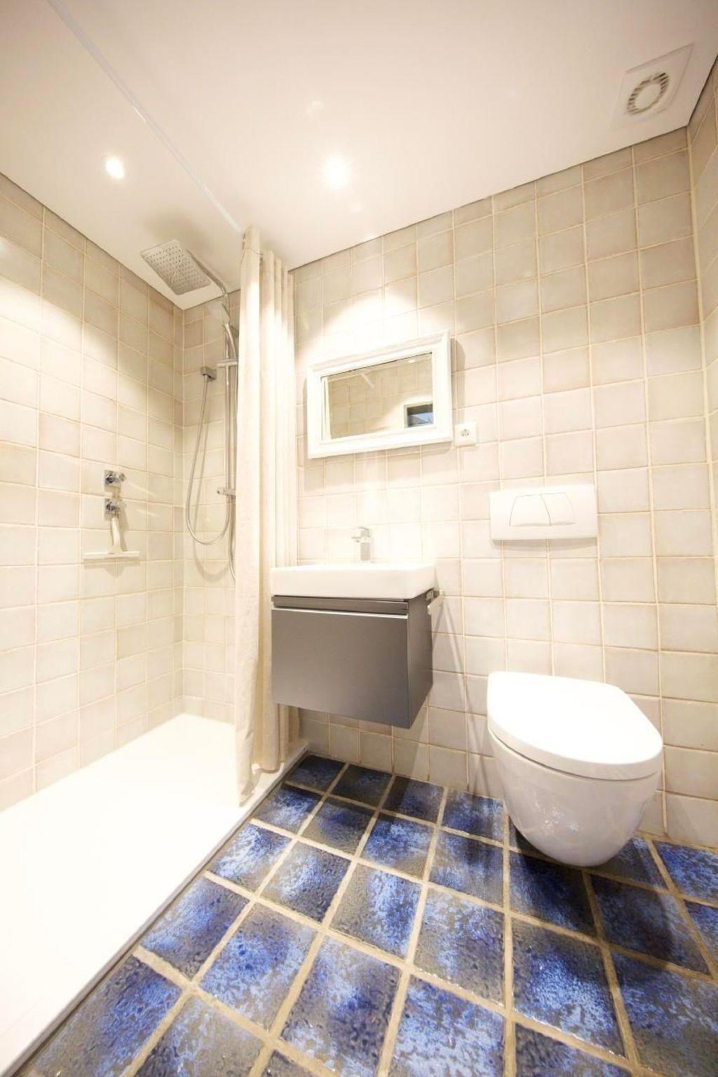 Badezimmer 2: Sehr große fast bodenebene Regendusche mit Thermostat und Leinenvorhang, kein Tageslicht, leiser Lüfter, Handtuchheizköper, renoviert in 2017.