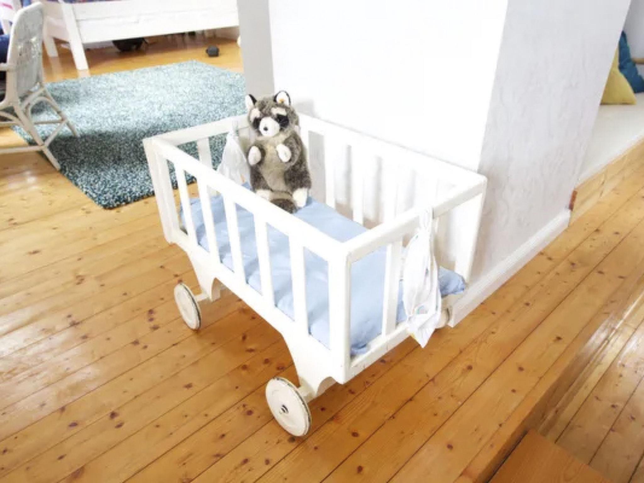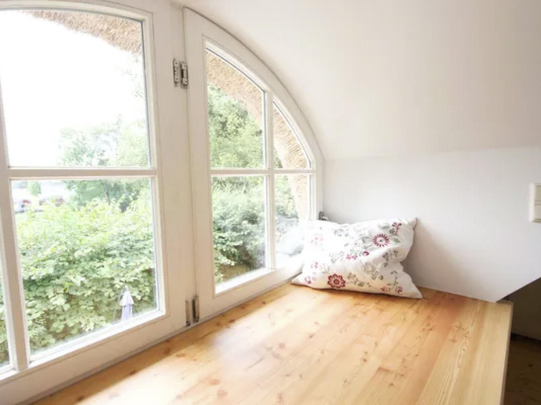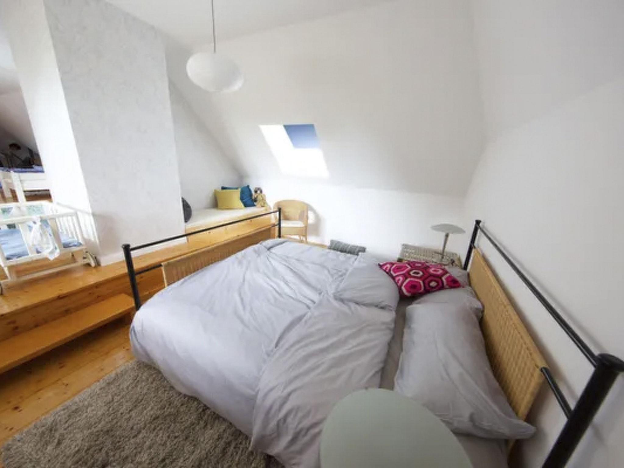 Schlafzimmer 4: Hier handelt es sich um den hinteren Teil des Dachgeschosses, vom vorderen durch einen Vorhang abtrennbar, akustisch nicht vom vorderen getrennt. Das Doppelbett misst 200cm mal 180cm. Das Kinderbett ist in einer Nische und ist nur 160cm mal 70cm groß. Geeignet für ein Kind bis zu einer Größe von max. 1,40m, Babywagen, Größe des Schlafzimmers Grundfläche eher 16m², aber Schrägen, da Dachgeschoss ACHTUNG: Zugang ins Dachgeschoss über eine steile und schmale Wendeltreppe, Benutzung auf eigene Gefahr, große Dachgaube mit Fensterbank zum Lesen und Träumen