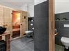 Das Naturstein-Duschbad aus brasilianischem Schiefer verfügt über eine finnische Sauna und handgefertigte Waschbecken aus Flussstein. Hier lassen sich wahre SPA-Momente erleben! Für zusätzlichen Komfort sorgt ein Gäste WC.