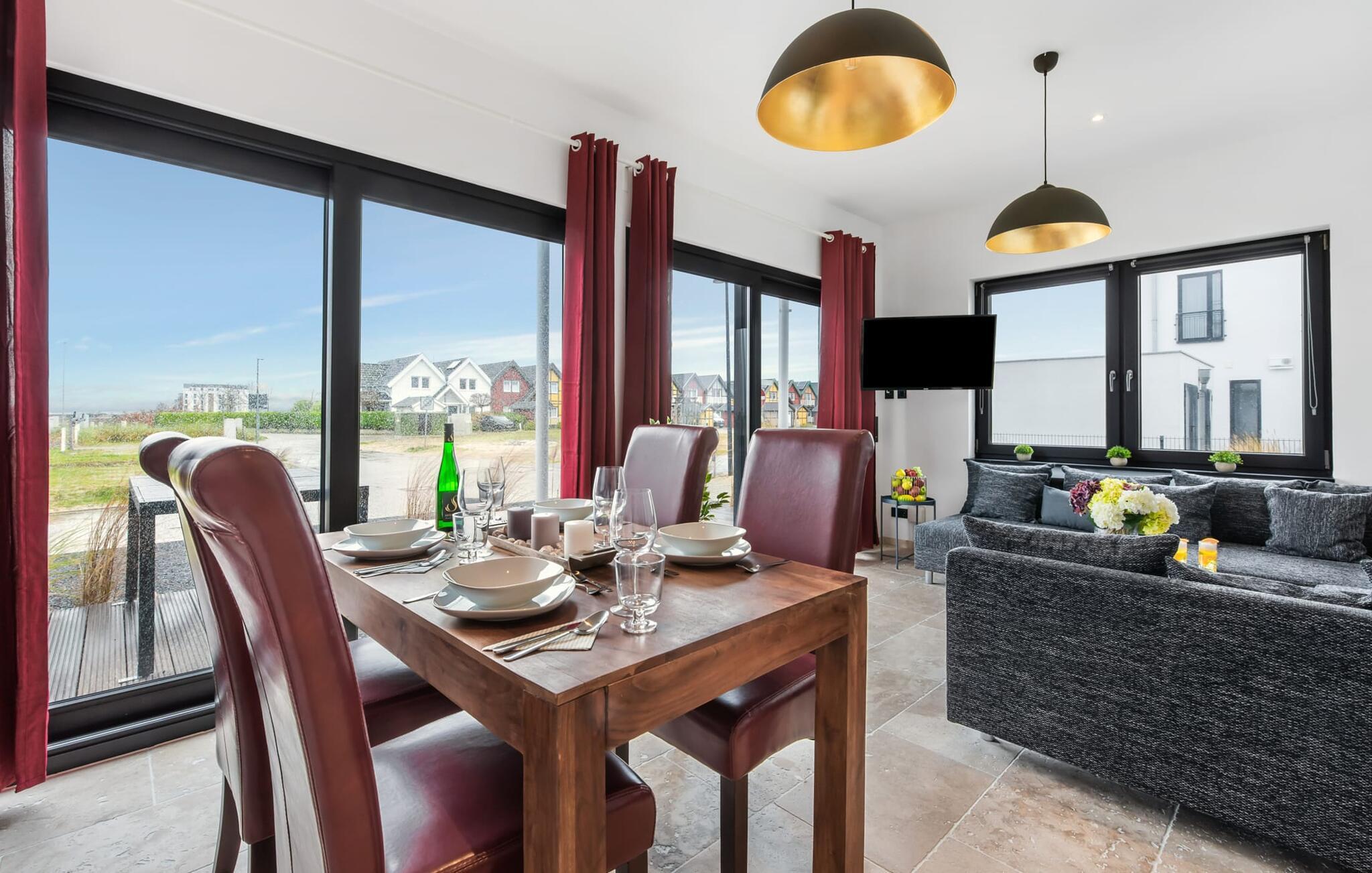 Der großzügige Wohn-/Essbereich im Erdgeschoss mit angrenzender Terrasse bietet ausreichend Platz für vier Personen. Naturstein Fußböden aus italienischem, hellen Travertin sowie das ökologische Baukonzept sorgen mit Ziegelmauerwerk und gekalkten Wänden für besonderes Raumklima. Dank großzügiger, bodentiefer Fensterfronten ist die Ferienwohnung lichtdurchflutet und freundlich.