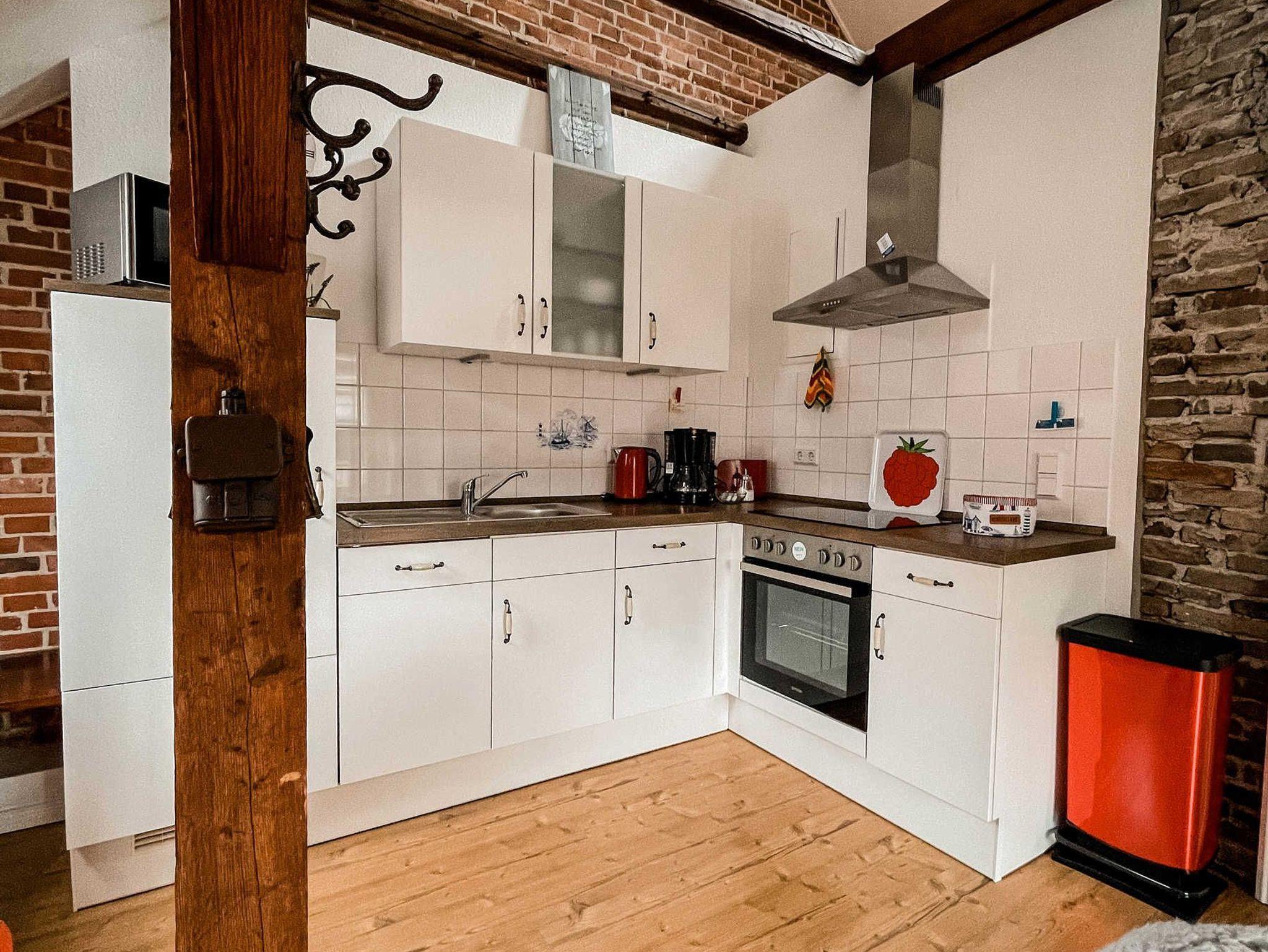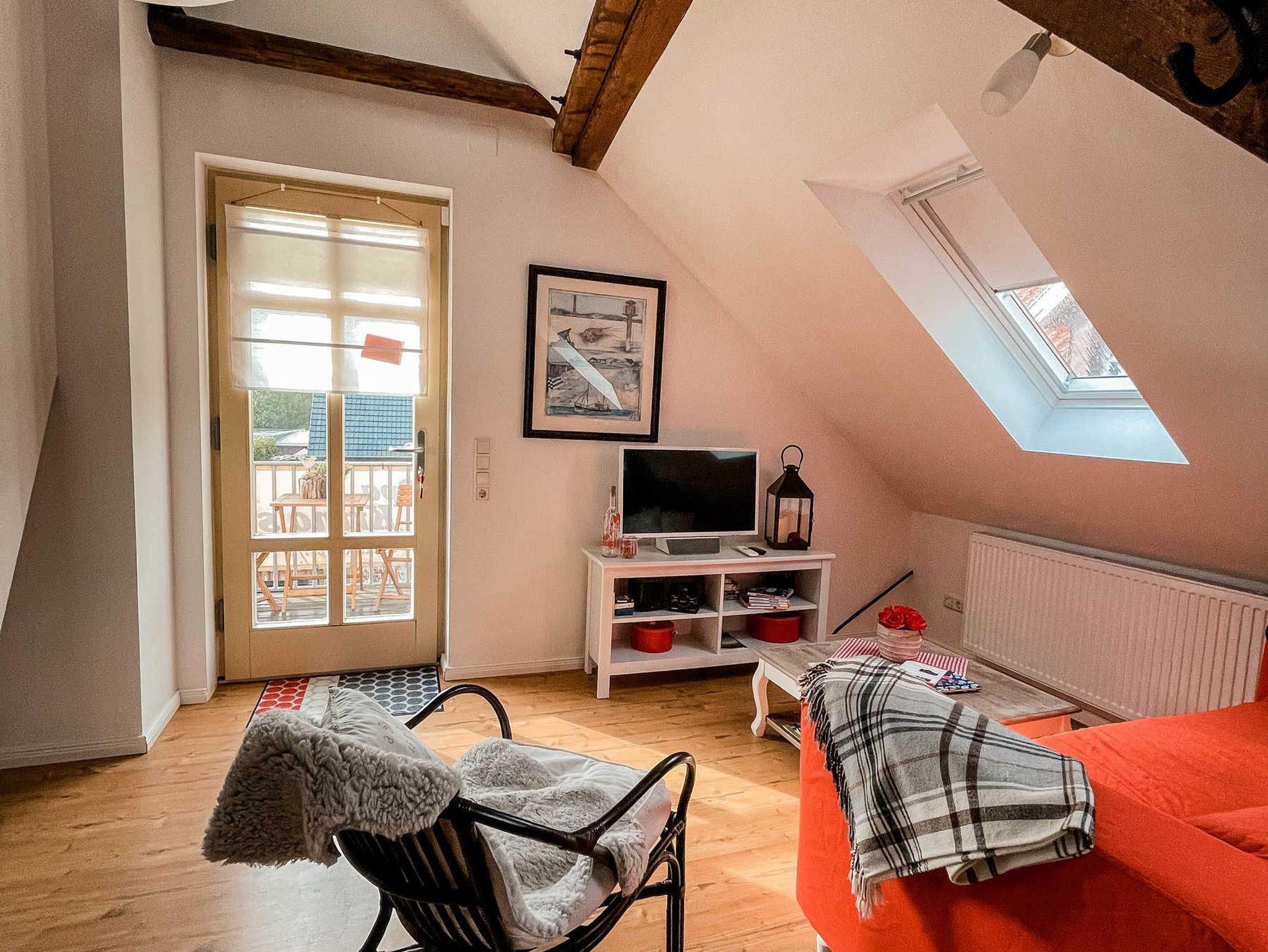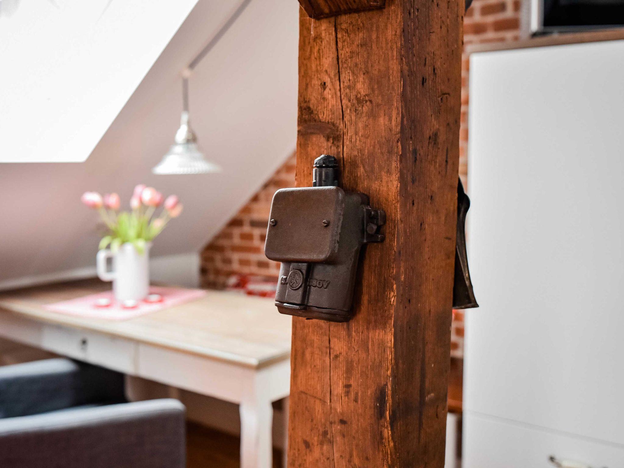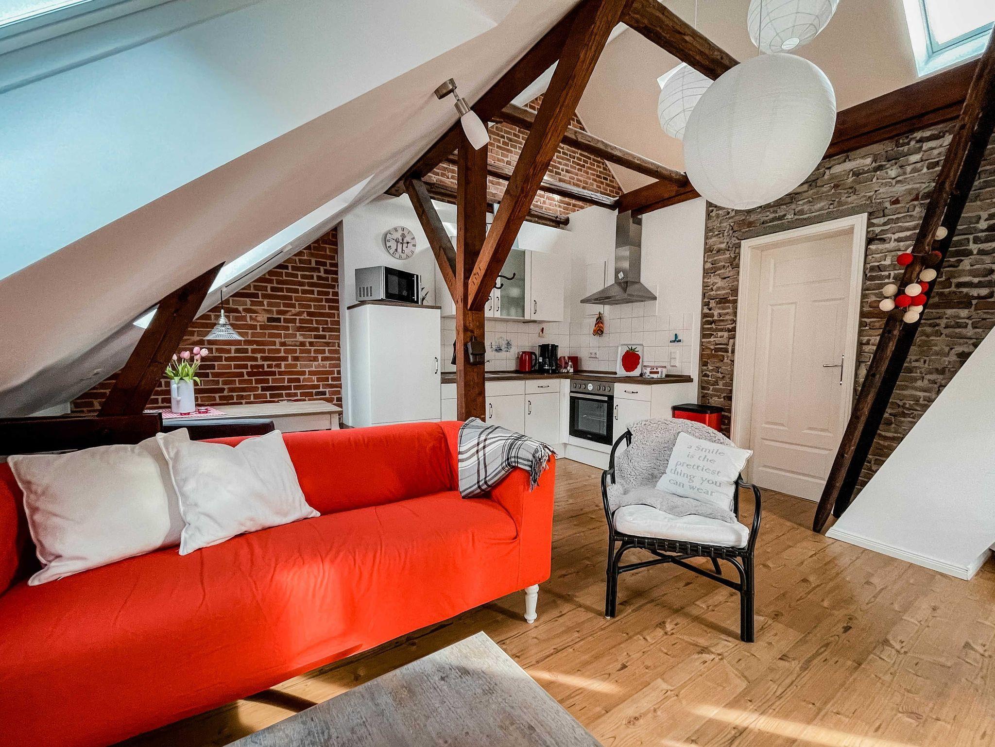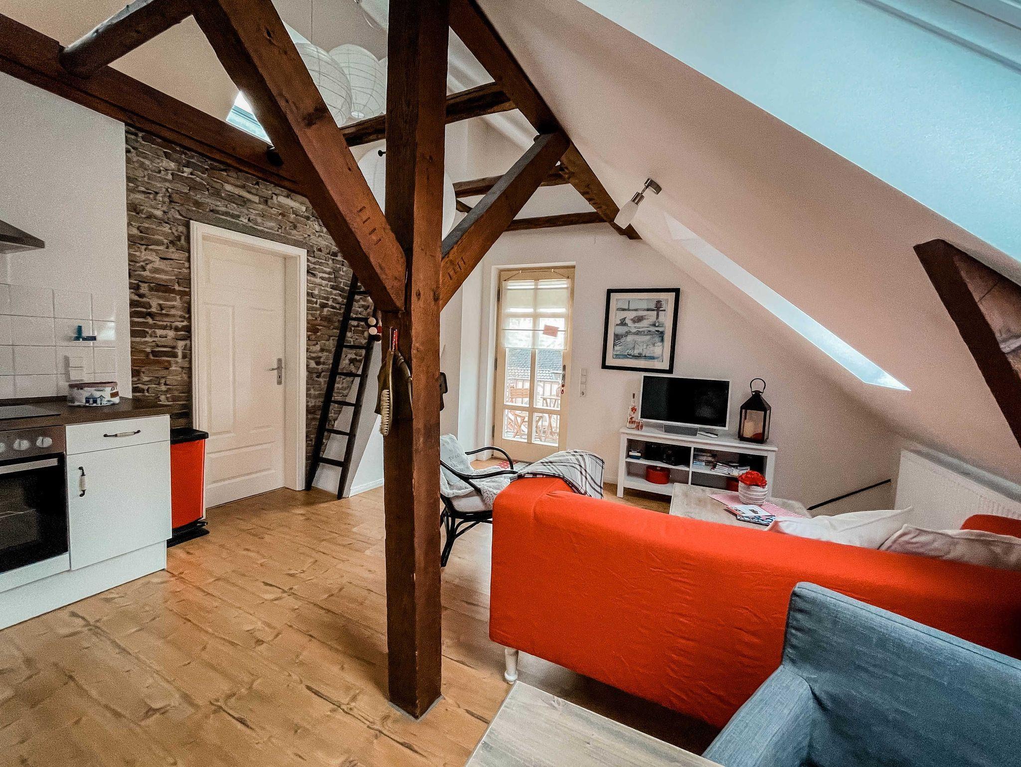 Die Nichtraucherwohnung ist 38qm groß, hat einen 6qm Balkon in Südlage und ist bis in die Dachspitze offen ausgebaut. Die Wohnung ist geeignet für max. zwei Erwachsene Personen und einem Kind bis zum Alter von drei Jahren. Das alte Balken- und Mauerwerk ist in Sicht und gibt der Wohnung in dem denkmalgeschützten Gebäude eine besondere Atmosphäre. Sie besteht aus Wohn-/Essraum, Schlafzimmer, Bad mit Dusche und WC. Küche mit Geschirrspüler, Kühlschrank, Backofen, Herd, Mikrowelle.