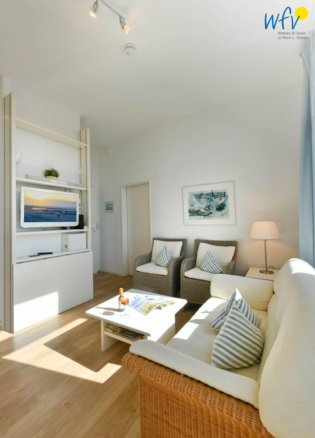 Eine bequeme Sitzecke mit TV und kleiner HiFi-Anlage lädt zum Fernsehen, Musik hören und Entspannen ein; ein Esstisch zu gemeinsamen Mahlzeiten.