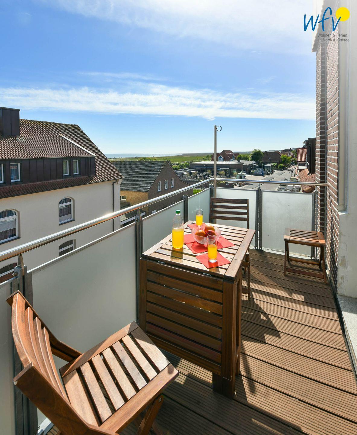 Auf dem möblierten Balkon der Ferienwohnung können Sie wunderbar entspannen, in Ruhe eine gutes Buch zu lesen oder einfach den schönen weiten Blick auf die Nordsee genießen. Ein herrliches Urlaubsgefühl!