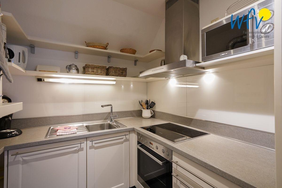 Im Wohnraum befindet sich zusätzlich ein Essbereich mit einem großem Esstisch. In der separaten Küche lassen sich auch im Urlaub leckere Gerichte zaubern. Sie ist u.a. mit Herd, Backofen, Spülmaschine und Kaffeemaschine ausgestattet.