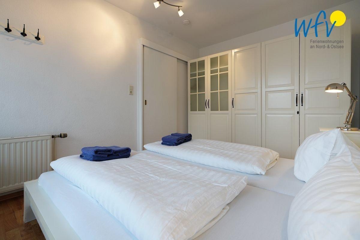 Das separate Elternschlafzimmer (untere Etage) ist mit einem bequemen Doppelbett und einem großen Kleiderschrank ausgestattet. In den zwei Schlafzimmern in der oberen Etage befinden sich zwei Einzelbetten bzw. ein Einzelbett.