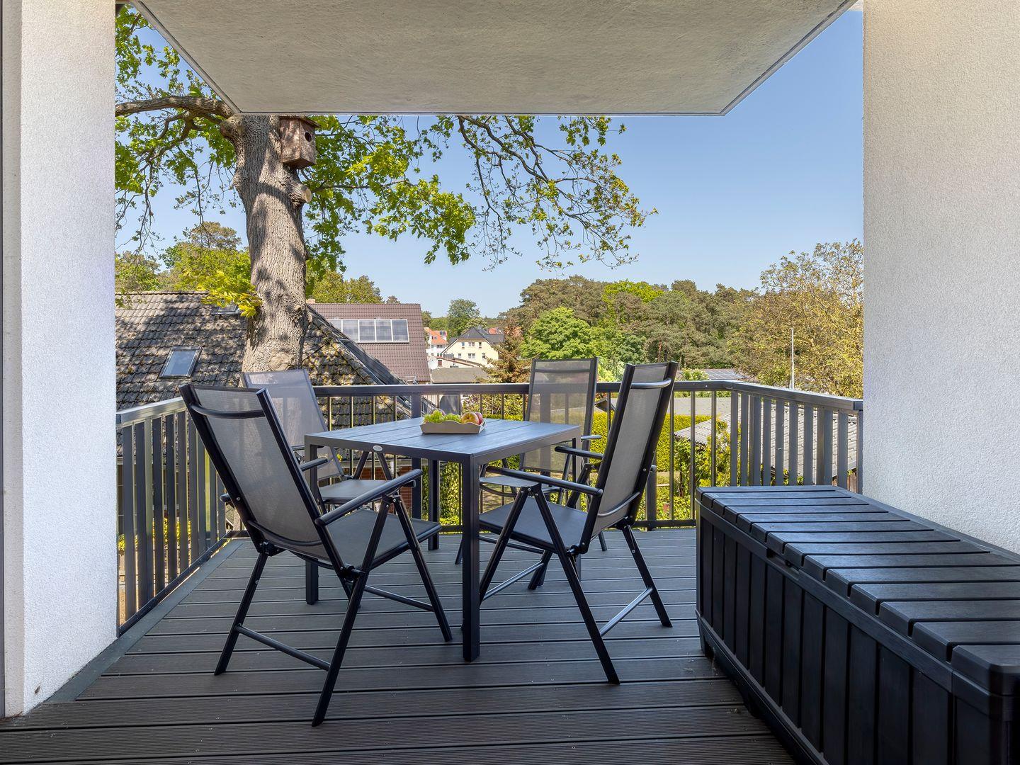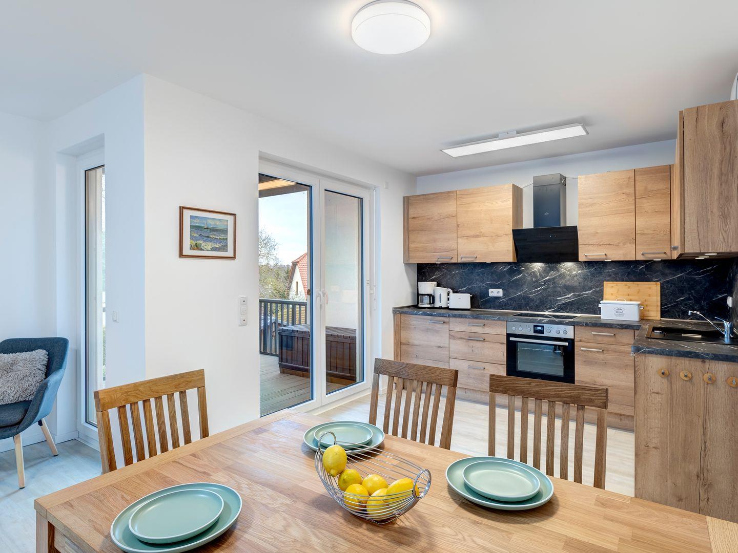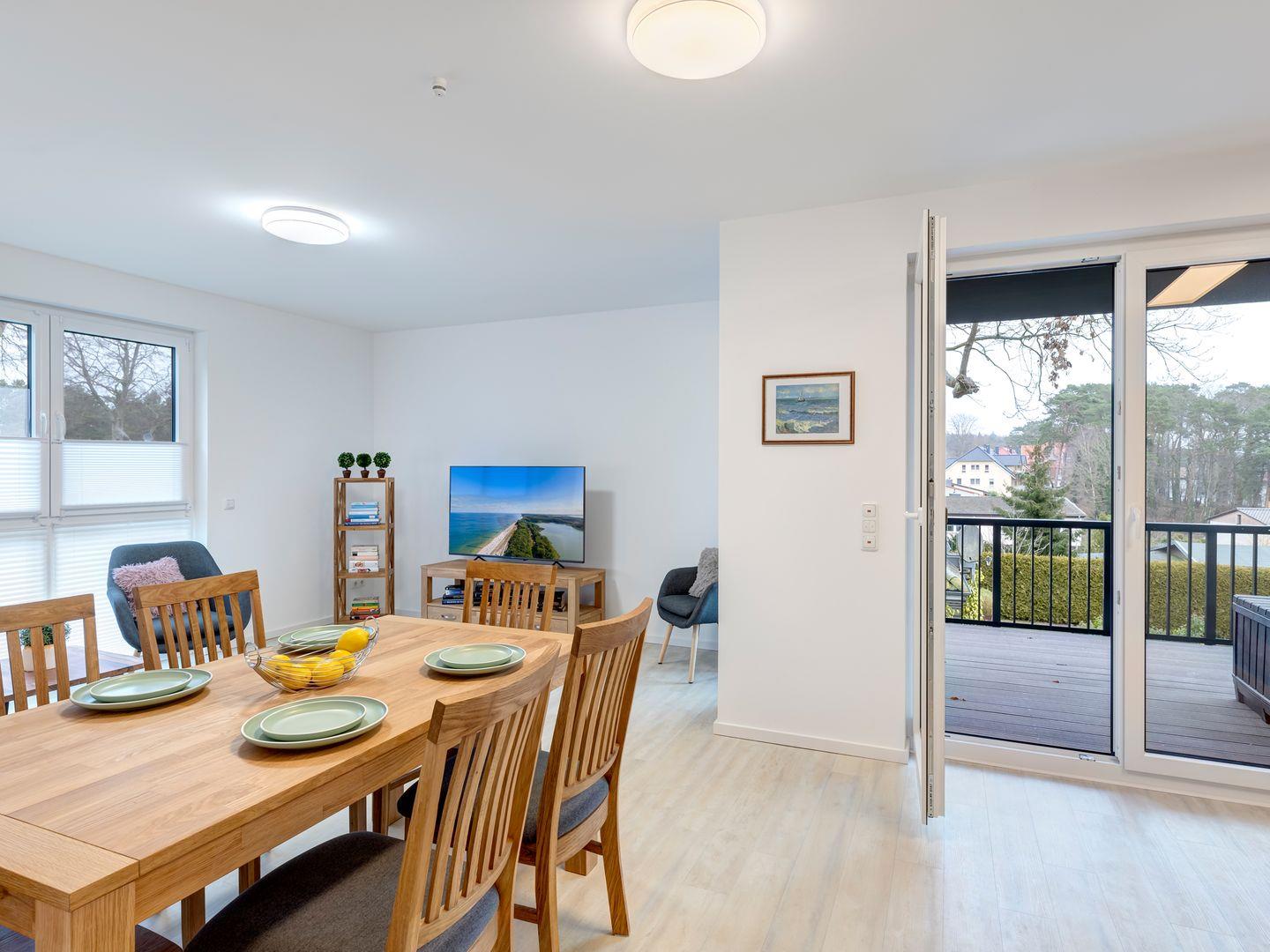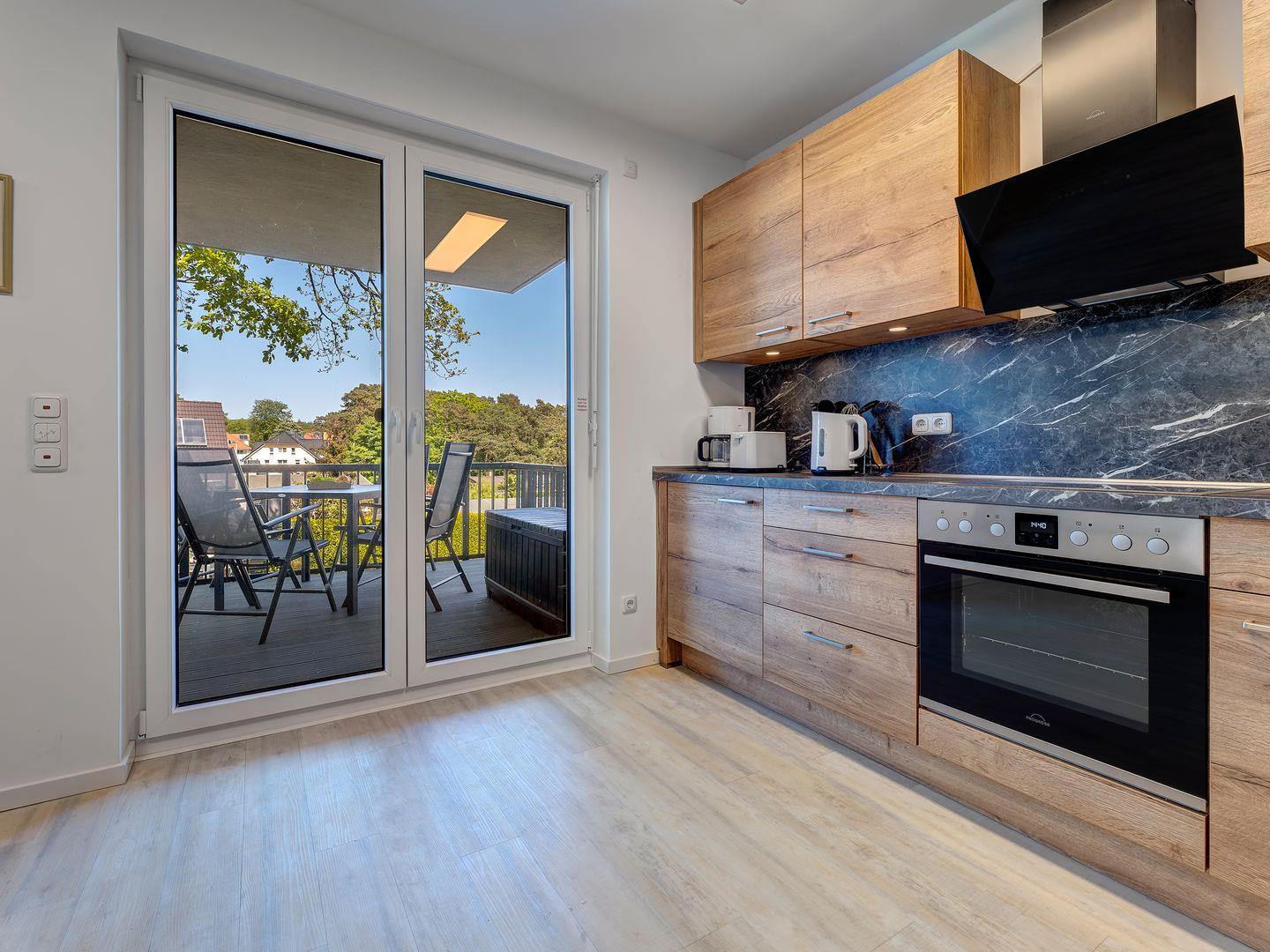 Luxuriöse Wohnung im Bernsteinquartier Kölpinsee mit Balkon, moderner Küche und Komfort für entspannte Urlaubstage.