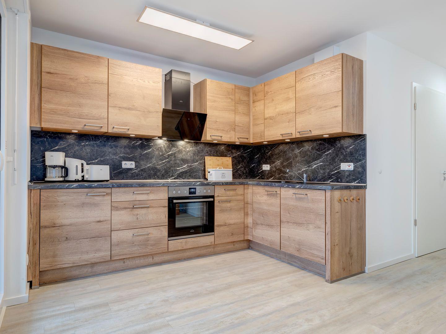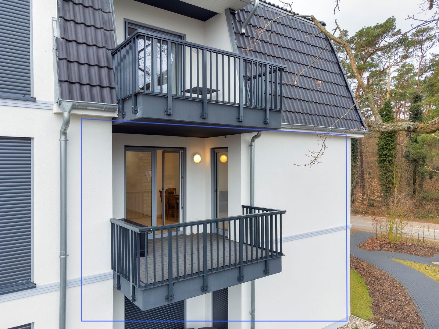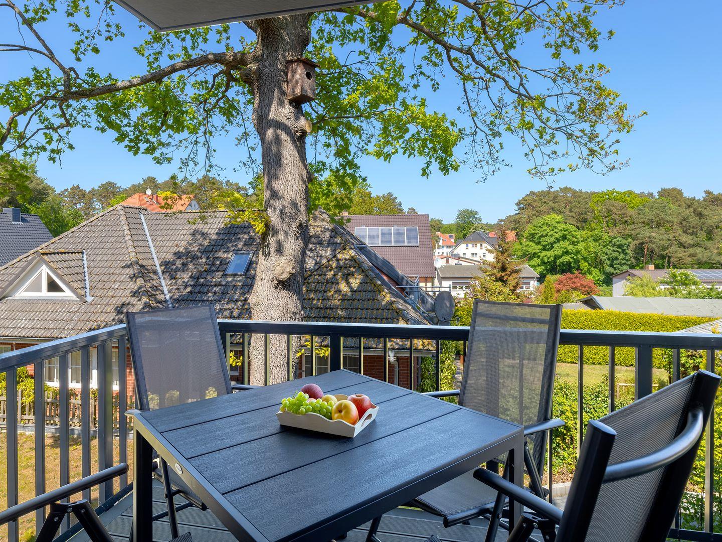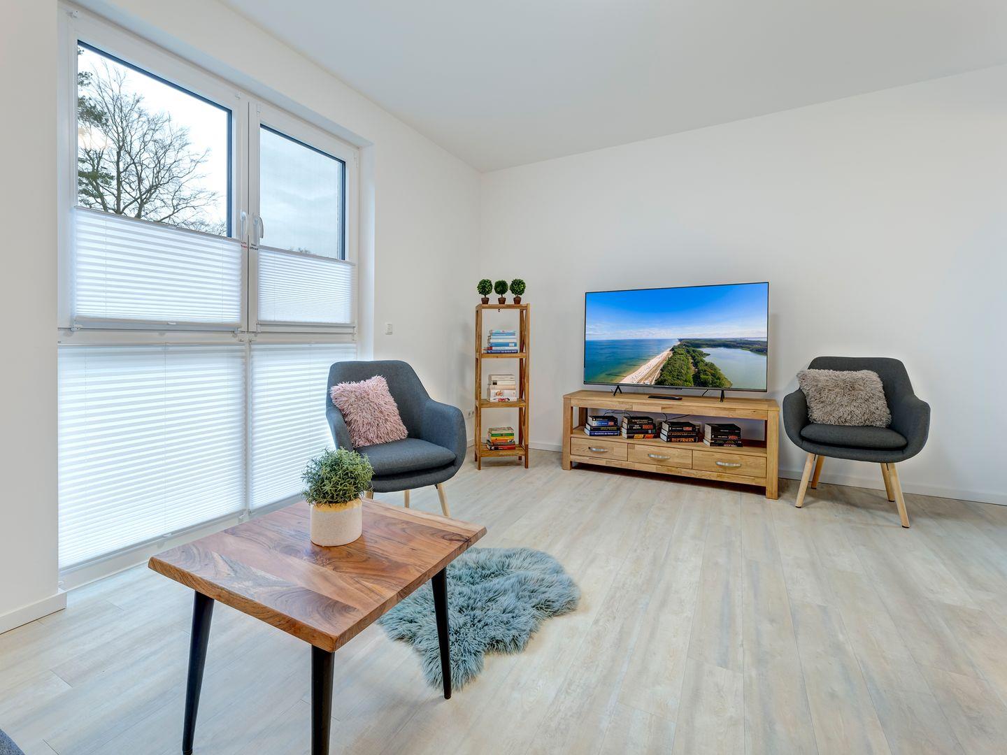 Luxuriöse Wohnung im Bernsteinquartier Kölpinsee mit Balkon, moderner Küche und Komfort für entspannte Urlaubstage.
