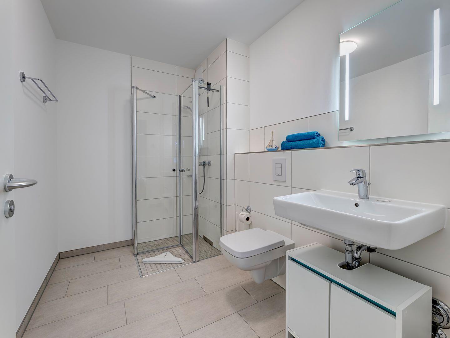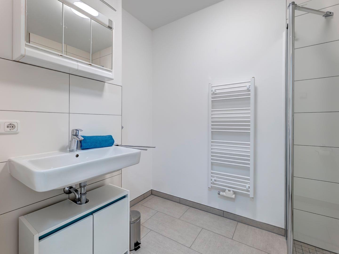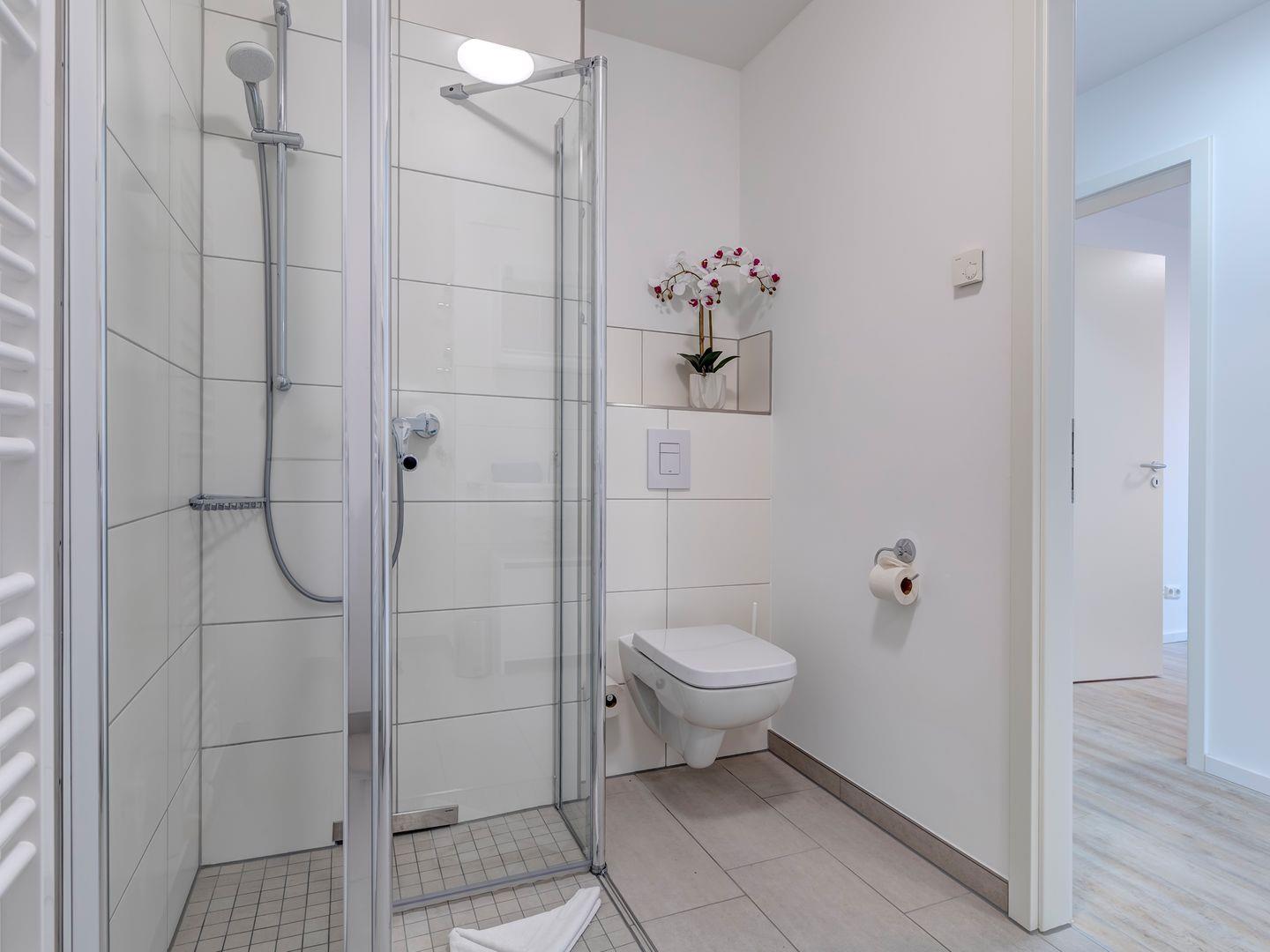 Das moderne Badezimmer verwöhnt Sie mit einer luxuriösen ebenerdigen Dusche, die Ihnen einen erfrischenden Start in den Tag bietet und gleichzeitig ein Gefühl von purem Komfort vermittelt.