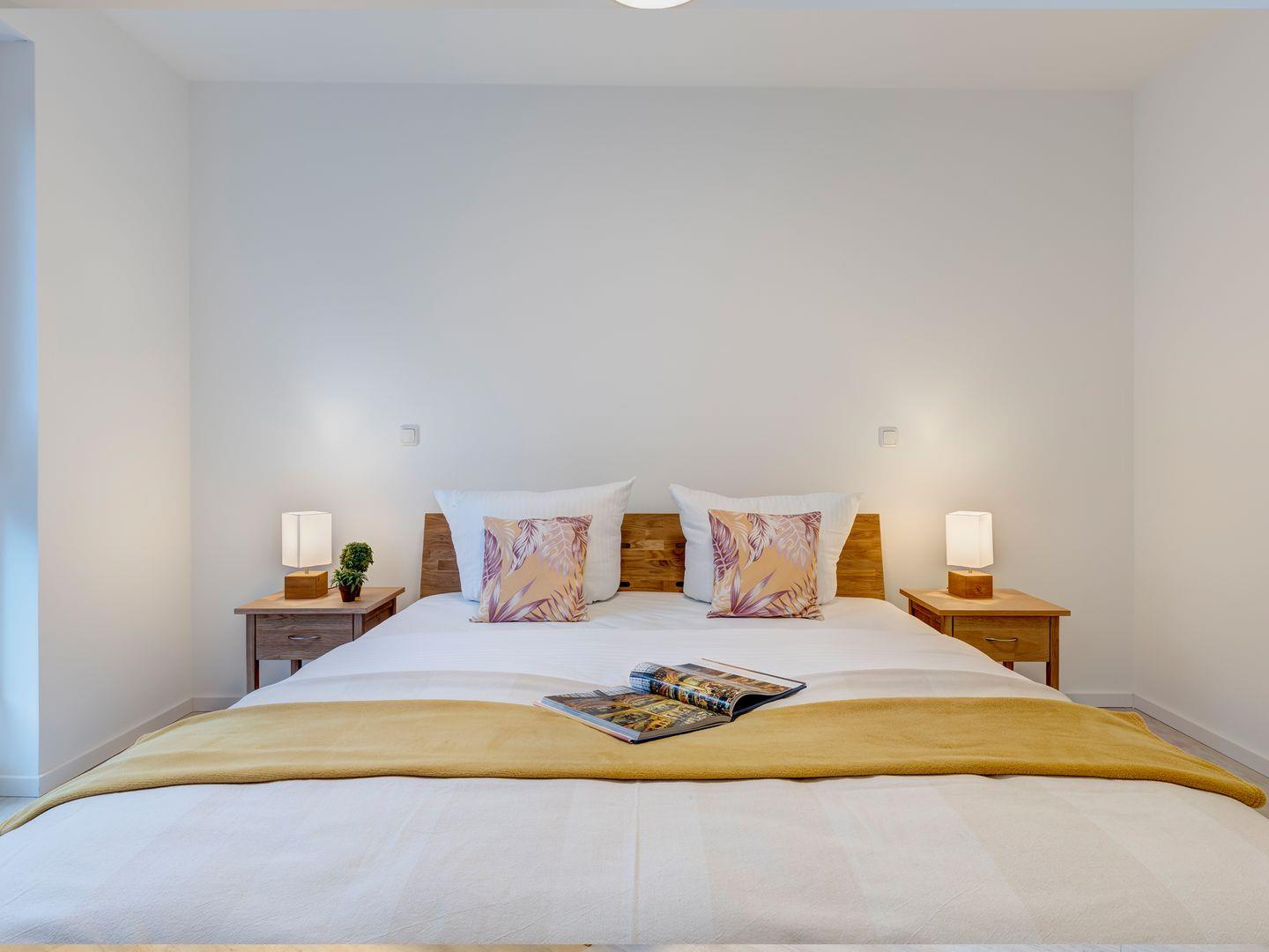 Diese großzügige Wohnung verbindet Luxus mit Hochwertigkeit und bietet Ihnen alles, was Sie für einen entspannten Urlaub benötigen. Zwei geschmackvoll eingerichtete Schlafzimmer mit gemütlichen Doppelbetten sowie ein Schlafsofa im Wohnzimmer bieten ausreichend Platz für bis zu fünf Erwachsene und ein Kleinkind.