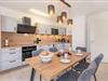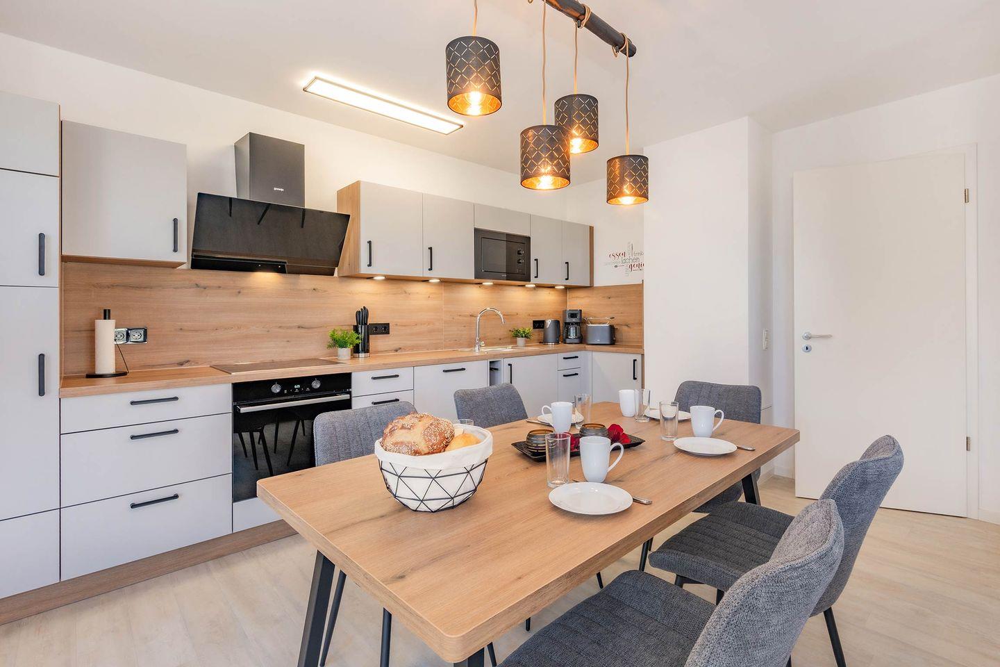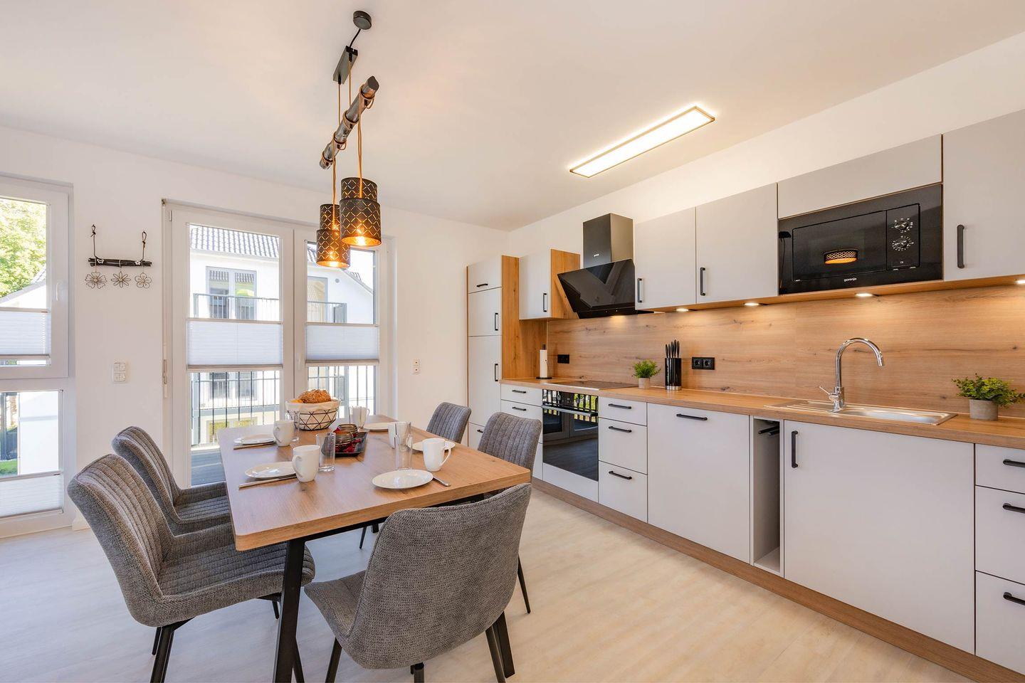 Die großzügige Wohnung mit 88 Quadratmetern Wohnfläche befindet sich in der ersten Etage und überzeugt durch ein elegantes, durchdachtes Raumkonzept mit hochwertiger Ausstattung. Mittelpunkt ist die offen gestaltete Wohnküche, die harmonisch in den Wohnbereich übergeht. Ausgestattet mit Backofen, Spülmaschine, Ceranfeld und weiteren modernen Geräten, bietet sie beste Voraussetzungen für genussvolle Kochabende. Ein stilvoller Esstisch lädt zu gemeinsamen Mahlzeiten ein, während der große Flat-TV im Wohnraum für Unterhaltung sorgt. Vom Wohnbereich gelangen Sie auf den sonnigen Südbalkon mit komfortabler Bestuhlung, der ideale Ort, um die frische Ostseeluft zu genießen und den Tag entspannt ausklingen zu lassen. Hochwertige Möbel, geschmackvolle Dekoration und eine warme Gestaltung schaffen ein Ambiente, das sofort zum Wohlfühlen einlädt.