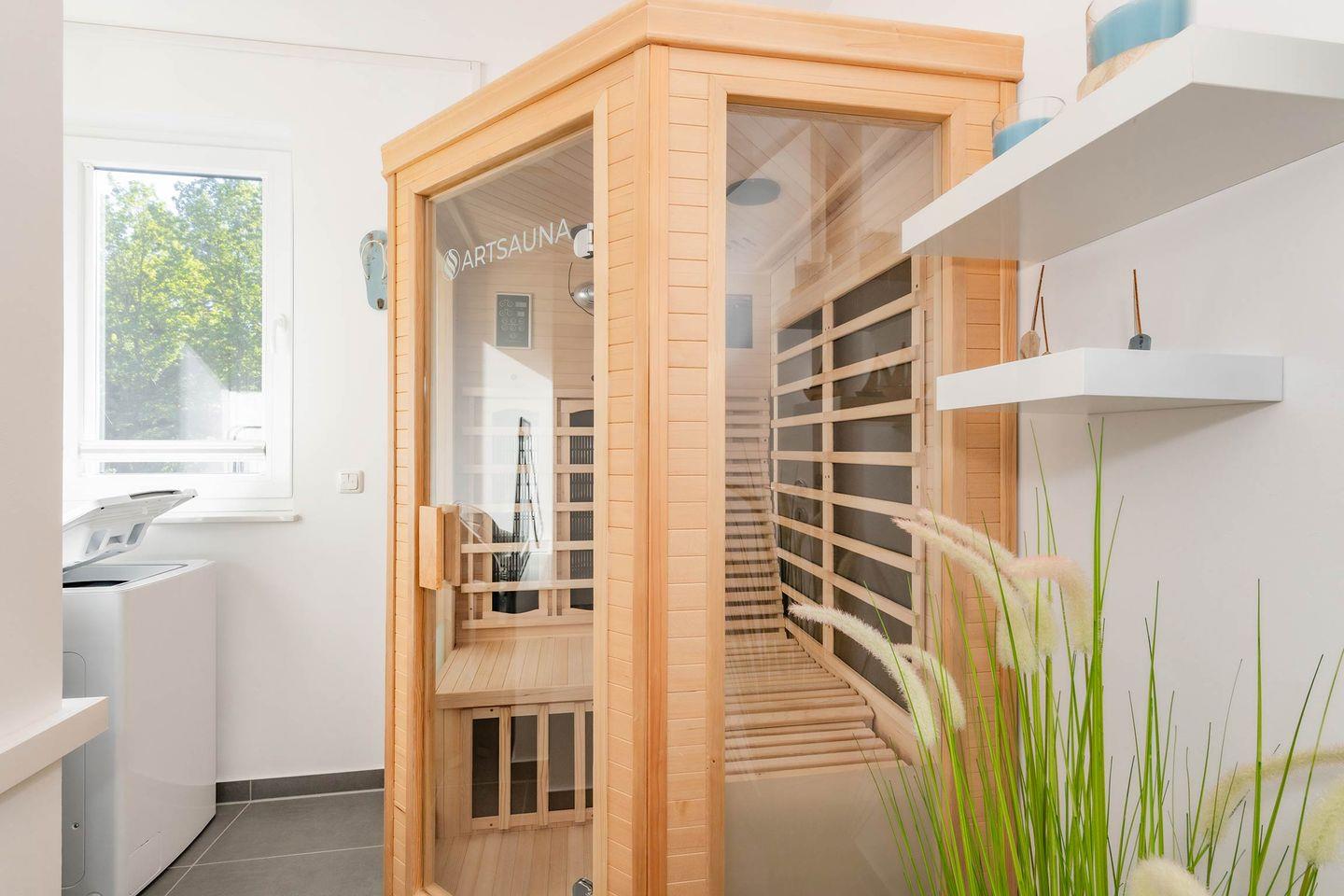 Ein besonderes Highlight dieser Ferienwohnung ist die private Infrarotkabine, die Ihnen wohltuende Wellnessmomente nach einem langen Strandspaziergang oder aktiven Urlaubstag ermöglicht. Hier genießen Sie Entspannung auf höchstem Niveau – ganz unabhängig von Wetter und Jahreszeit.