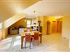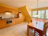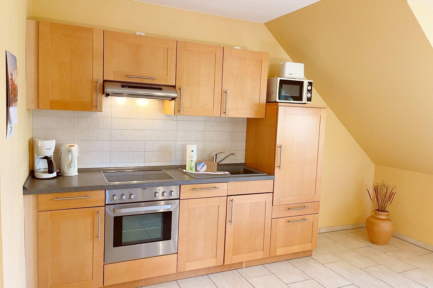 Die Wohnung erstreckt sich über drei lichtdurchflutete Zimmer, darunter zwei gemütliche Schlafzimmer, die durch ihre geschmackvolle Einrichtung und liebevollen Details bestechen. Ein solidarisches Wohngefühl entsteht im offenen Wohn- und Essbereich, der mit einer komfortablen Sitzecke, einem Esstisch und einem Kaminofen ausgestattet ist. Hier können Sie entspannte Abende verbringen und den Blick auf die wunderschöne Umgebung genießen. Die moderne Küche ist mit allen Annehmlichkeiten ausgestattet, einschließlich Geschirrspüler, Mikrowelle, Backofen und Kaffeemaschine, sodass beim Kochen Ihrer Lieblingsgerichte keine Wünsche offen bleiben.