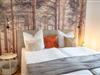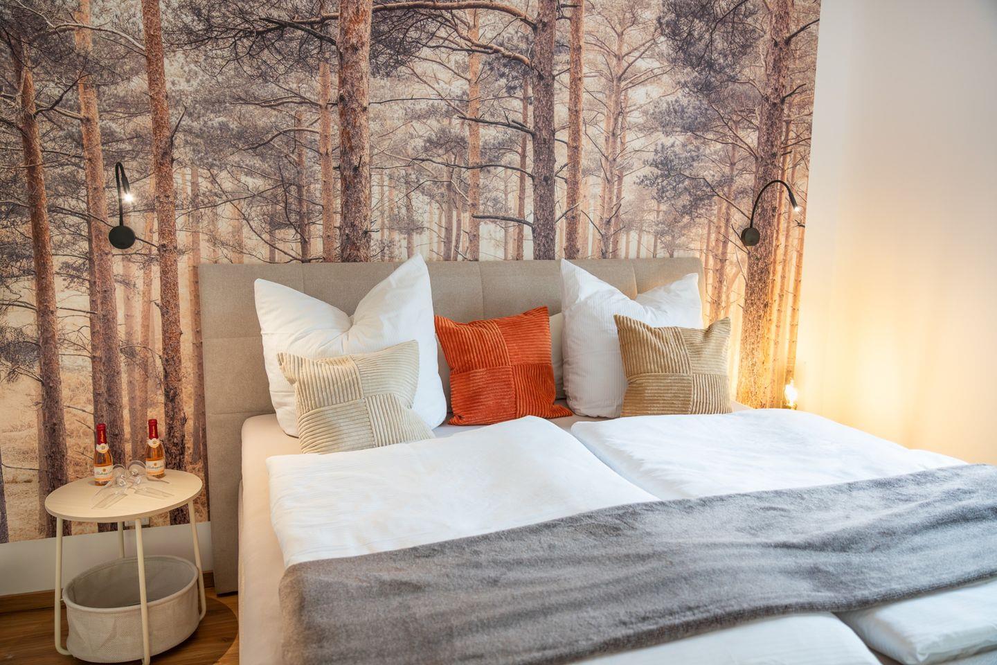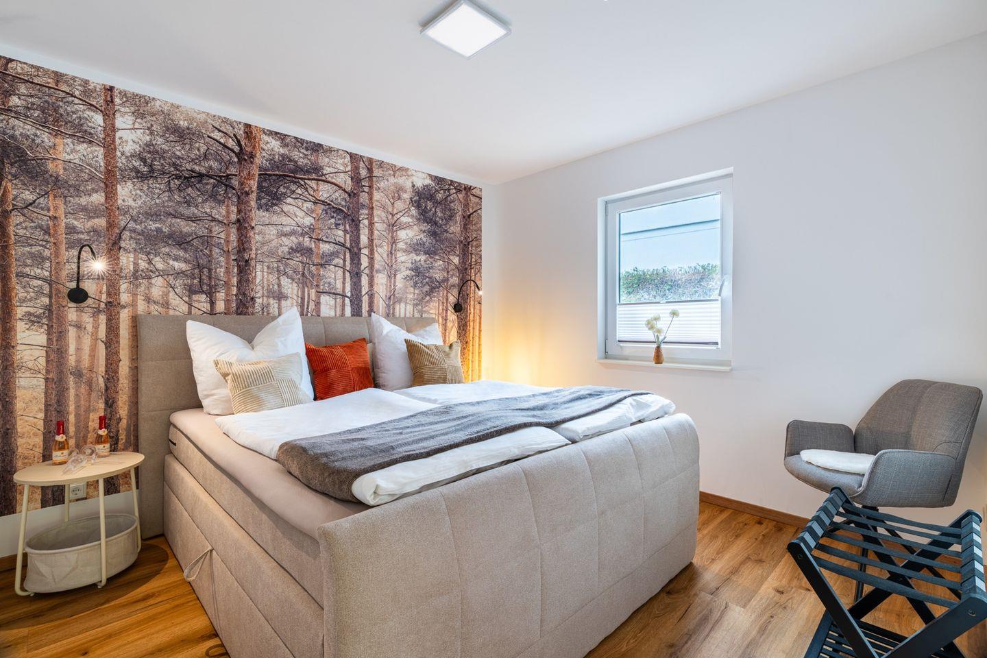 Das Schlafzimmer verfügt über bequeme Schlafmöglichkeiten und ist – wie der Wohnbereich – mit allergikerfreundlichem Vinylboden ausgestattet. Die Ferienunterkunft ist mit hochwertiger Bettwäsche und Handtüchern ausgestattet. Babys sind ebenso willkommen, wie Kinder und Jugendgruppen. Familien profitieren von einem Ganzkörperspiegel, einem Kosmetikspiegel und zusätzlichem Stauraum in Form von Garderobe, Schuhschrank und Kommode. Ein Wäscheständer steht zur Verfügung.