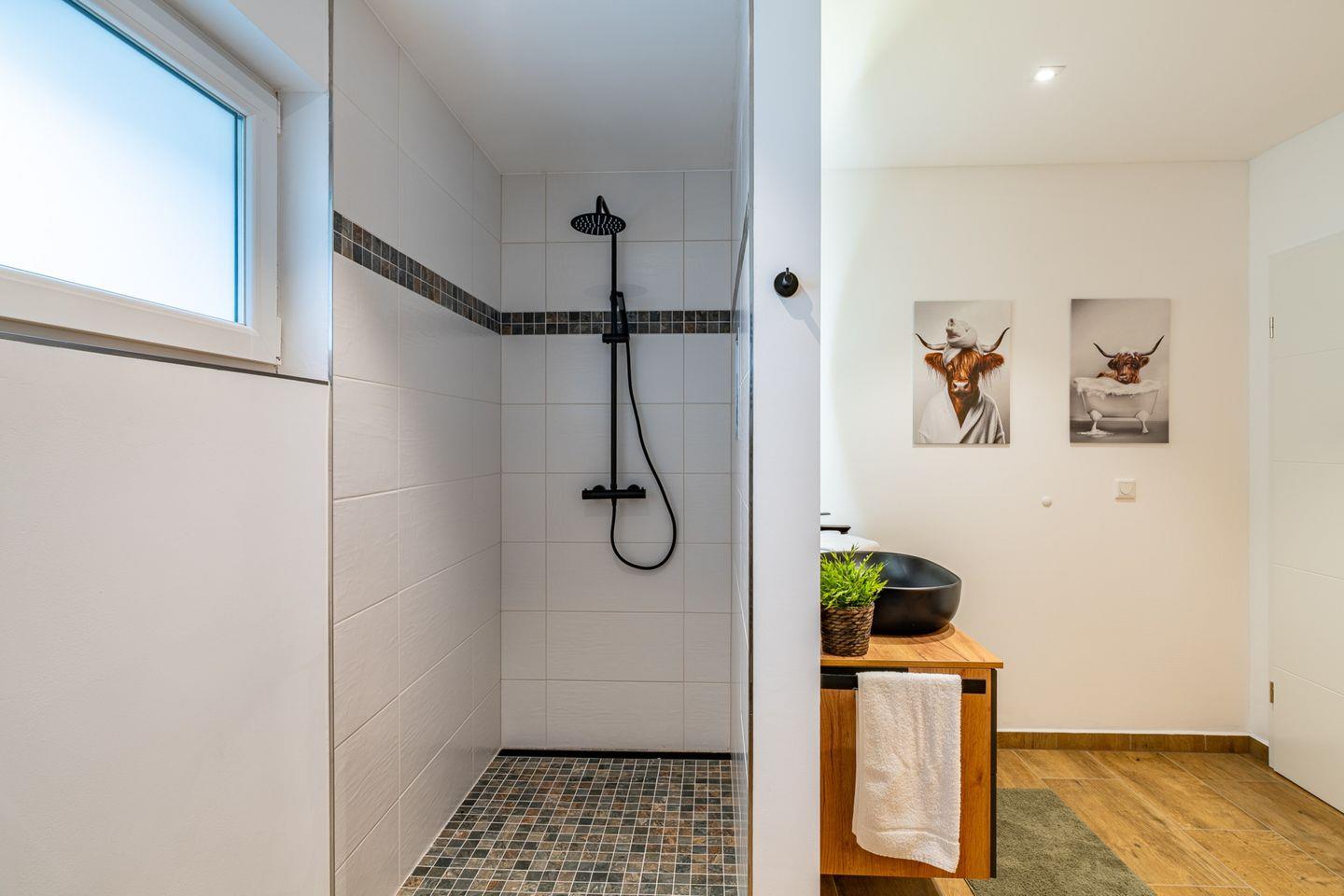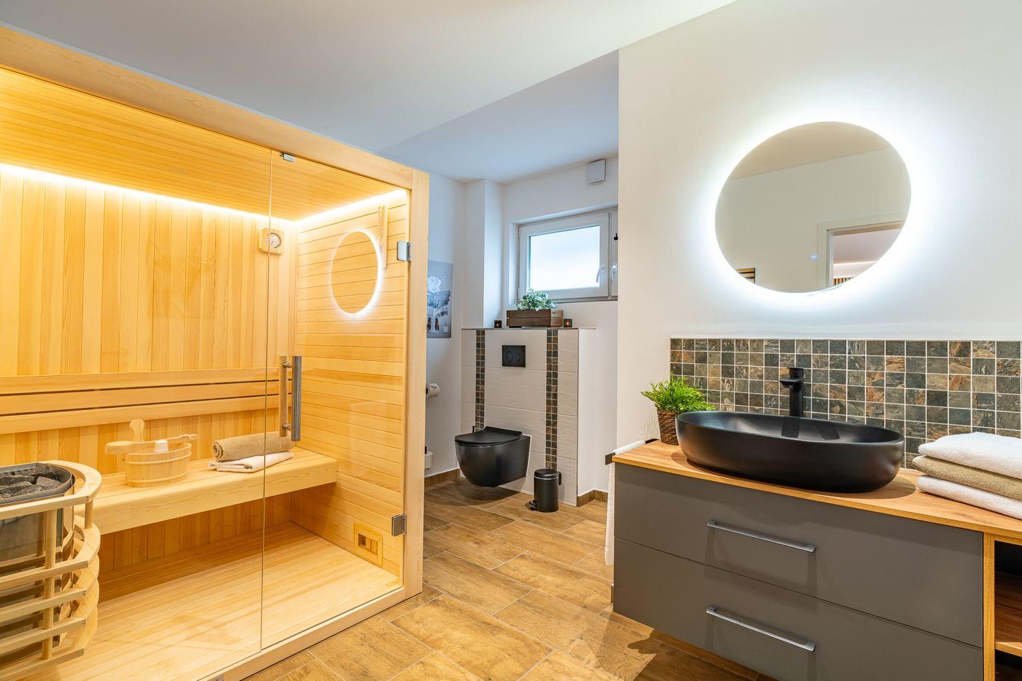 Das moderne Badezimmer verfügt über eine bodengleiche Dusche, Waschbecken, Fenster, Spiegel und Haartrockner sowie warme Wasserzufuhr. Im gesamten Haus sorgt eine Zentralheizung mit angenehmer Fußbodenheizung für wohlige Temperaturen zu jeder Jahreszeit. Ein besonderes Highlight ist die private Sauna zur Eigennutzung, die zu entspannten Wellnessmomenten einlädt.