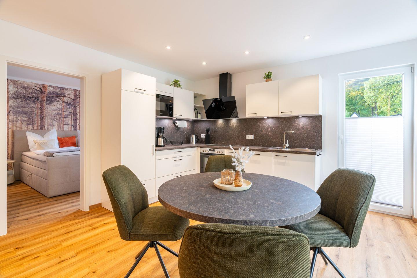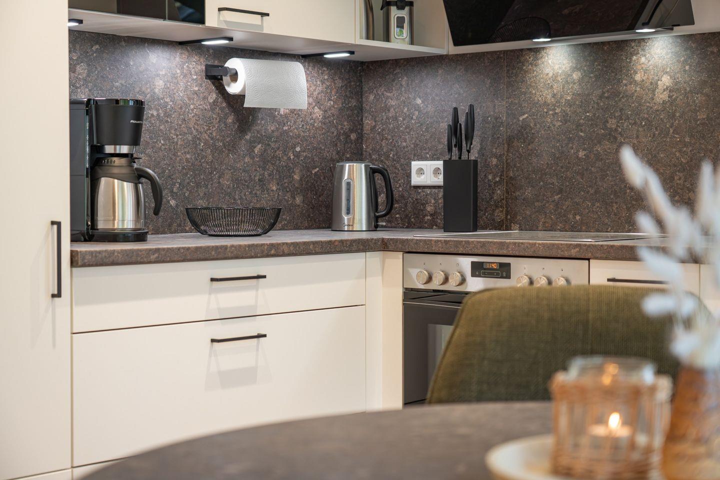 Das geräumige Wohnzimmer ist geschmackvoll eingerichtet und bietet eine gemütliche Sofaecke sowie einen Essbereich mit Esstisch. Hier finden Sie moderne Unterhaltungselektronik: Ein großer Satelliten-TV (44 – 55 Zoll), digitaler TV-Anschluss, internationale Kanäle und ein Radio stehen zur Verfügung. Die offene Küche ist direkt an das Wohnzimmer angeschlossen und umfassend ausgestattet. Sie finden dort einen Ceranherd, einen Backofen mit Elektroanschluss, eine Mikrowelle, Spülmaschine, Kühlschrank mit Gefrierfach, Wasserkocher, Kaffeemaschine, Toaster sowie sämtliche Küchenutensilien, Geschirr und Besteck. Damit genießen Sie auch im Urlaub höchsten Kochkomfort. Ein Staubsauger und Abfalleimer sorgen für zusätzliche Bequemlichkeit.