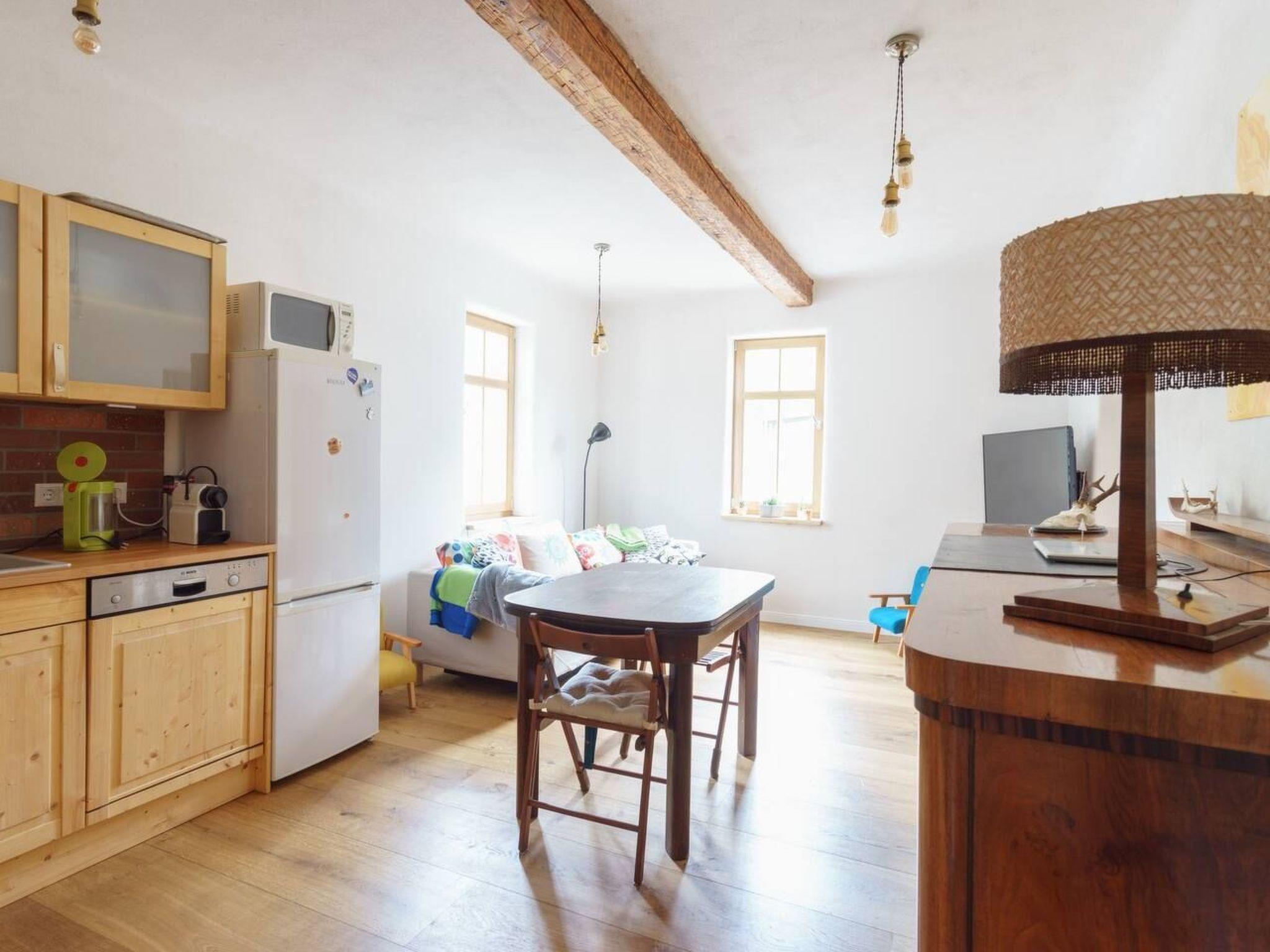 Unsere Ferienwohnung ist ca. 50qm groß und bietet Platz für bis zu vier Personen. Sie verfügt über ein Schlafzimmer mit einem Doppelbett und einem Babybett, ein Wohnzimmer mit einem Schlafsofa und einem Smart TV, ein Bad mit Dusche und Föhn und eine Küche mit allem, was Sie für eine leckere Mahlzeit brauchen: Herd, Backofen, Mikrowelle, Spülmaschine, Kaffeemaschine, Wasserkocher und Toaster. Die Wohnung ist frisch nach ökologischen Aspekten mit Holzfenstern und Lehmputz saniert, was für ein ausgezeichnetes Raumklima sorgt.