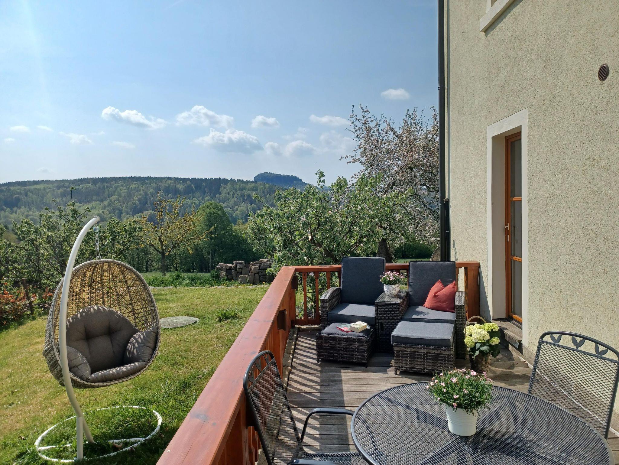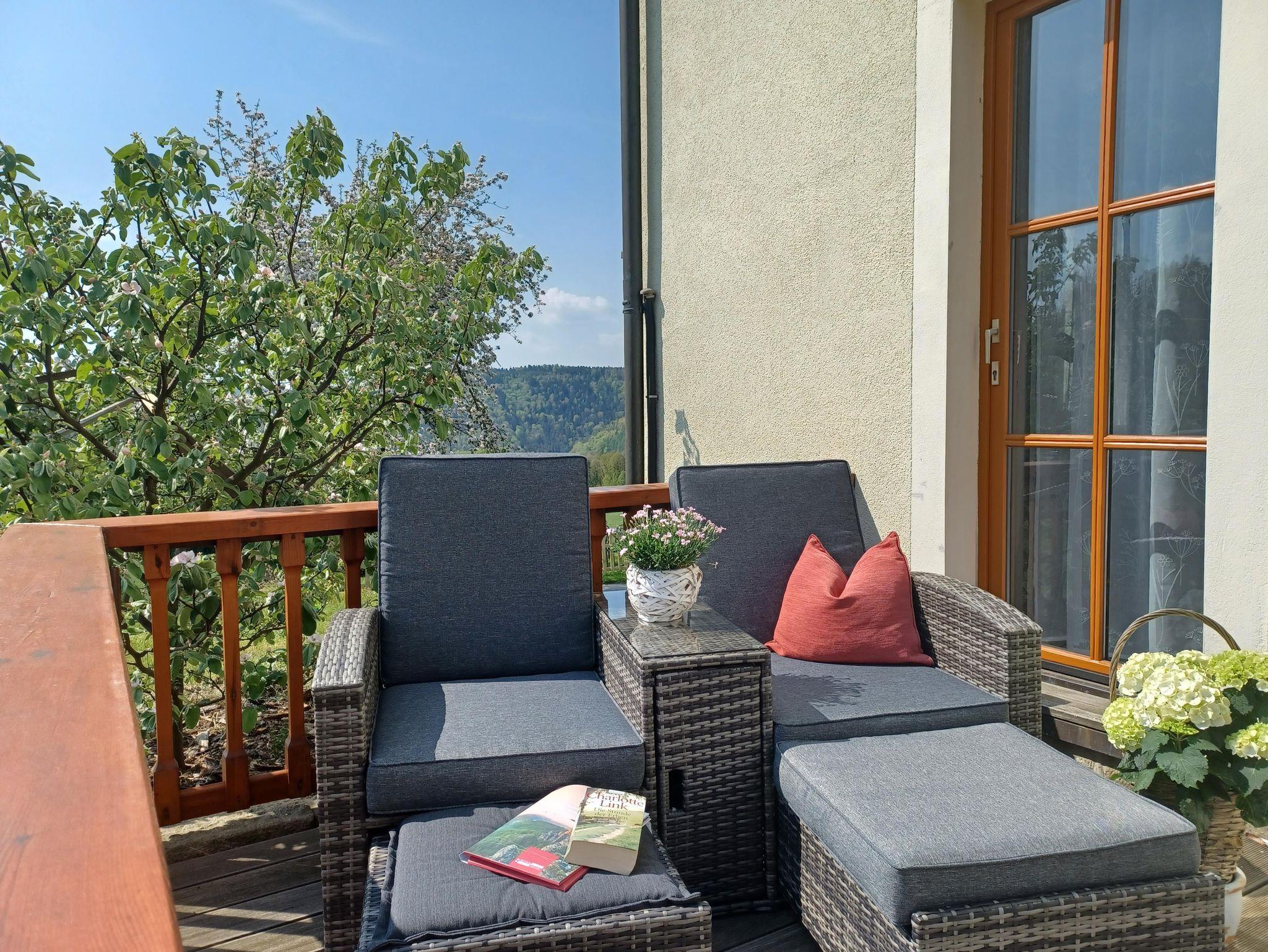 Ferienwohnung im Erdgeschoss mit zwei separaten Schlafzimmern (1 x Doppelbett, 1x 2 Einzelbetten) und einer gemütlichen Wohnküche mit Küchenzeile und Sitzecke sowie TV. Die Küchenzeile ist ausgestattet mit einem Herd mit 4 Cerankochfeldern u. Backofen, Kühlschrank, Geschirrspüler, Kaffeemaschine, Wasserkocher und Toaster. Das Bad verfügt über Dusche und WC. Von der Terrasse genießen Sie einen wunderbaren Blick zum Lilienstein.