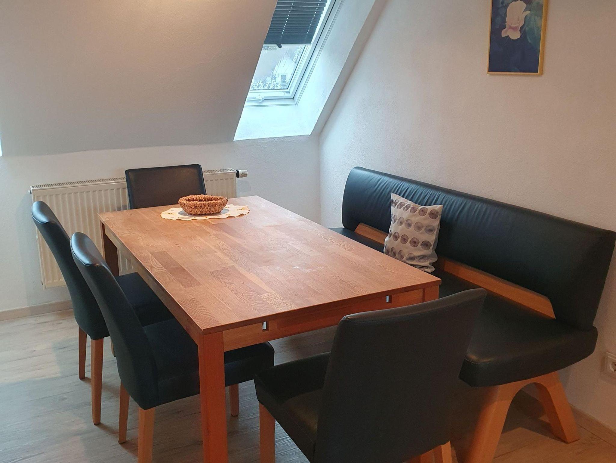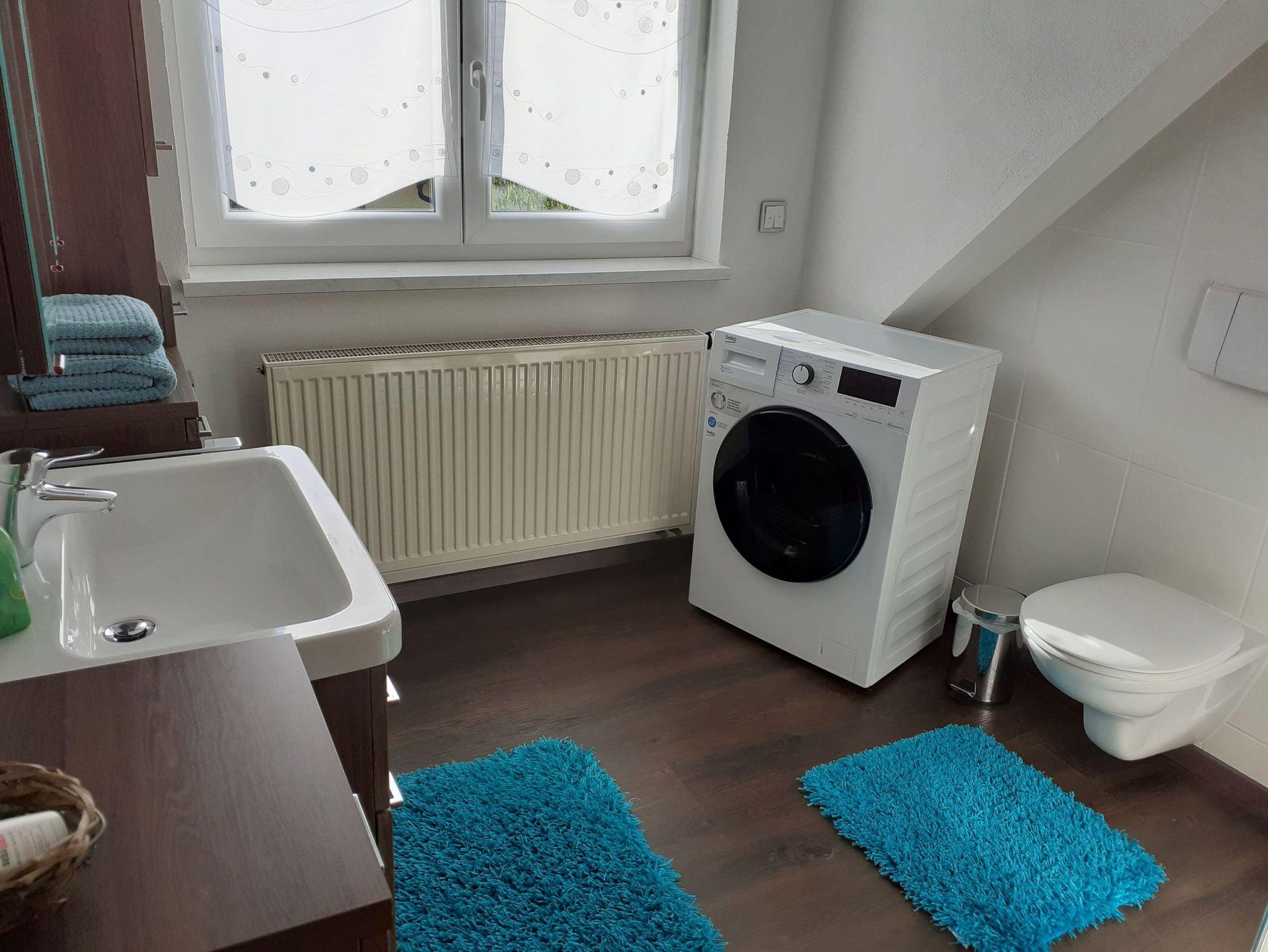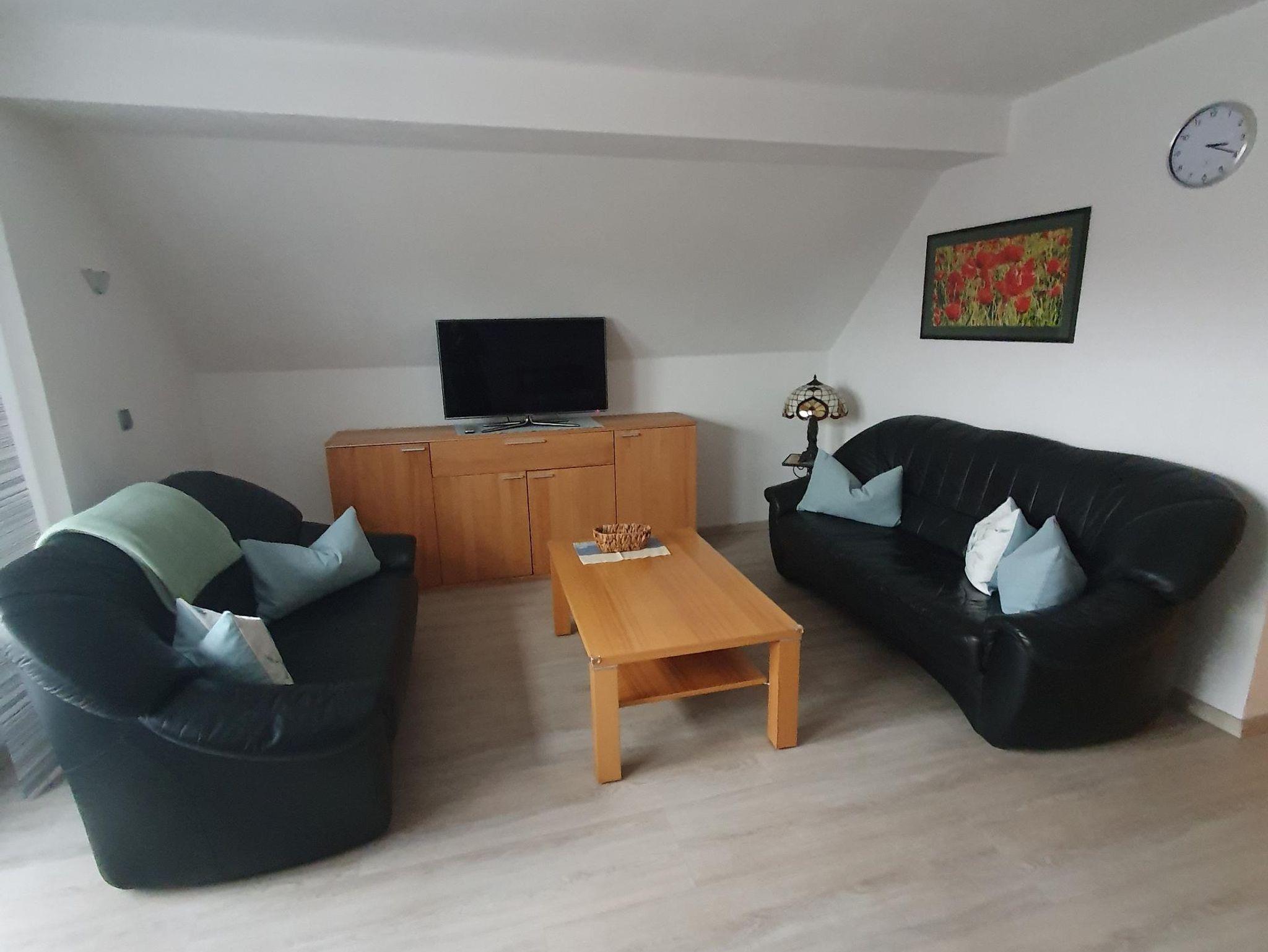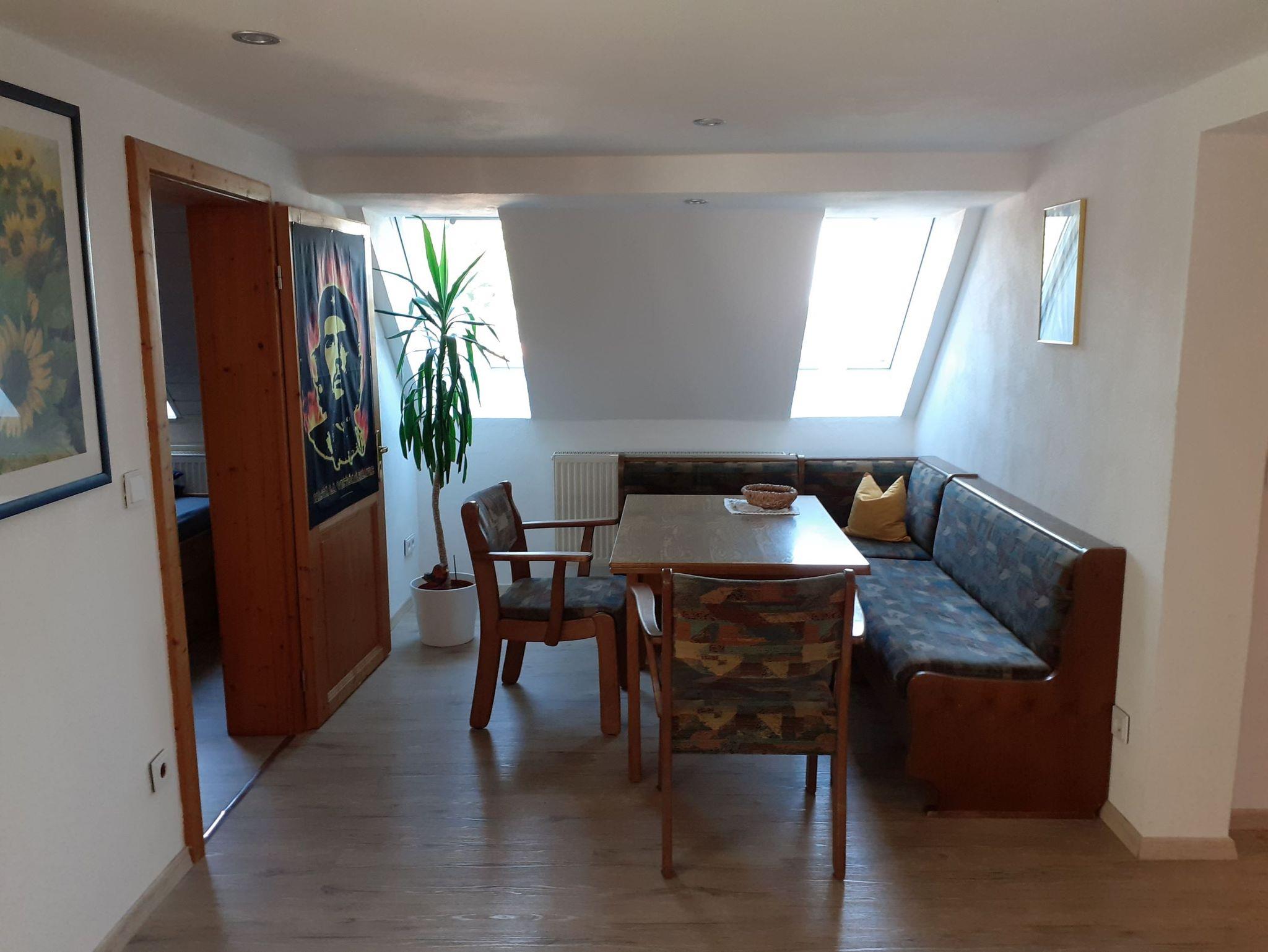 Die Ferienwohnung (67qm) befindet sich im Dachgeschoss unseres Hauses und bietet Platz für 4 Personen, mit Zustellbett sogar für 5 Personen. Sie verfügt über ein Schlafzimmer mit französischem Bett (1,40 x 2m )mit Flachbild-TV, und ein Wohn-Schlafzimmer mit 2Einzelbetten (die man auch zu einem Doppelbett zusammen stellen kann ) und Sitzbereich mit Flachbild-TV. Die komplett ausgestattete Küche mit Geschirrspüler, Kühlschrank, Herd, Backofen, Wasserkocher und Toaster lässt keine Wünsche offen. Einem geräumigen Badezimmer mit Dusche, WC, Waschtisch mit großem Spiegel, Fön und eine Waschmaschine mit integriertem Trockner rundet das Gesamtbild ab. Eine kleine Sitzgruppe und Parkmöglichkeit befindet sich vorm Haus. Bettwäsche und Handtücher sind vorhanden.