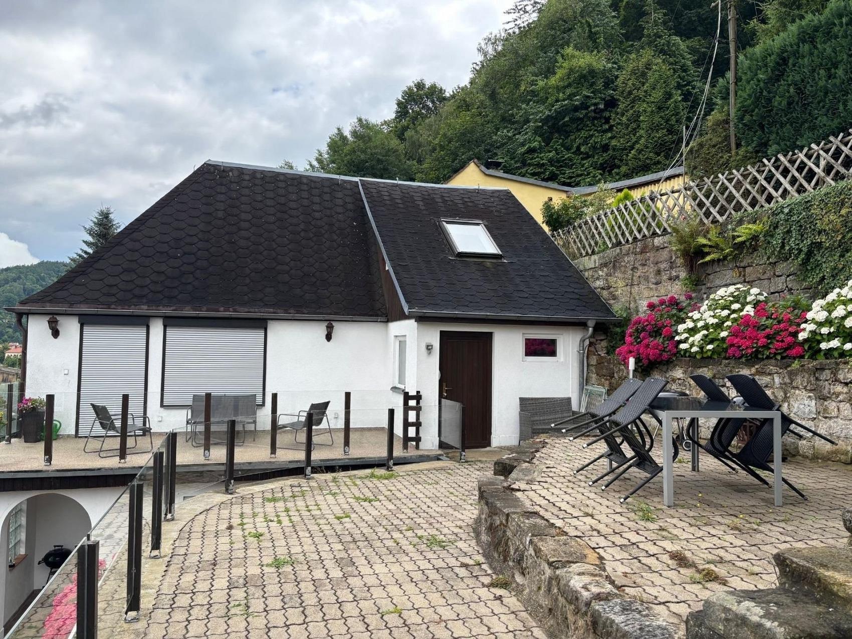 Ferienhaus mit zwei Wohnungen, einer hier angebotenen Loftwohnung mit 80 qm für 4 Personen über 2 Etagen.Im ganzen Nichtraucher Haus ist WLAN vorhanden.In diesem Teil des Hauses befindet sich ein Kaminzimmer von 23 m²mit gemütlicher Sitzecke und eine Terasse mit Blick über das Elbtal. Das Holz für den Kamin ist im Preis mit inbegriffen.Außerdem ist ein Esstisch für sechs Personen undein großer Flatscreen mit Satellitenfernsehen vorhanden.Von diesem Raum aus haben sie auch den Zugang zur großen Terrasse 15 m²welche mit Sitzmöbel und Tisch ausgestattet ist.Eine Küche 11 m² mit kompletter Ausstattung wie ein Kochfeld, Spülmaschine,Kaffeemaschine, Toaster, Kühlschrank, Mikrowelle mit Umluftbackofen, Wasserkocher.Ein Bad 13 m² mit Eckbadewanne sowie Toilette eine eigene Saunafür bis zu 4 Personen. (Benutzung der Sauna im Preis enthalten)Im Obergeschoss befindet sich das Loft von 21m² mit gemütlicher Sitzecke,sowie ein hinterer Bereich mit einem Doppelbett. Aus den Fenstern ist die einmaligeAussicht entlang des Elbverlaufes zu sehen.Auf dieser Etage befindet sich auch ein Schlafraum 12m² mit Doppelbett undgroßem Schrank. Aus dem Fenster über dem Doppelbett sehen siedirekt in den Abendhimmel. Das Haus liegt am Elbhang und der Zugang erfolgt über einenWeg der teiweise ohne Geländer ist.Ein Zugang zur kleinen Wohnung von 40 qm ist vorhanden so das auchdas gesamte Haus genutzt werden kann.Falls sie mit mehr Personen reisen möchten können sie die Wohnung 2 mit buchenund das gesamte Haus mit bis zu 8 Personen buchen.