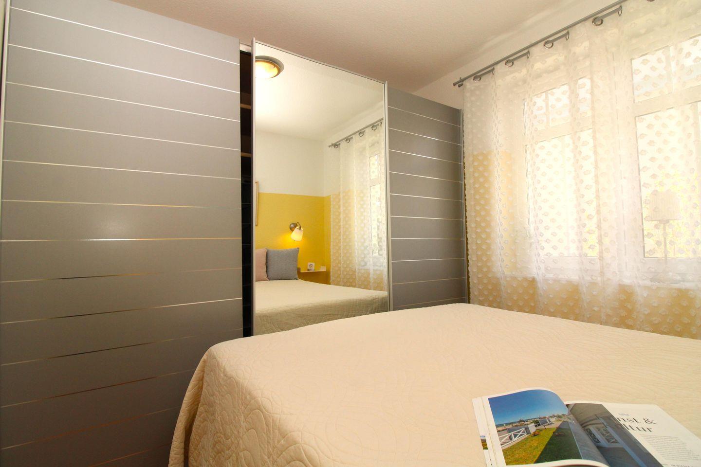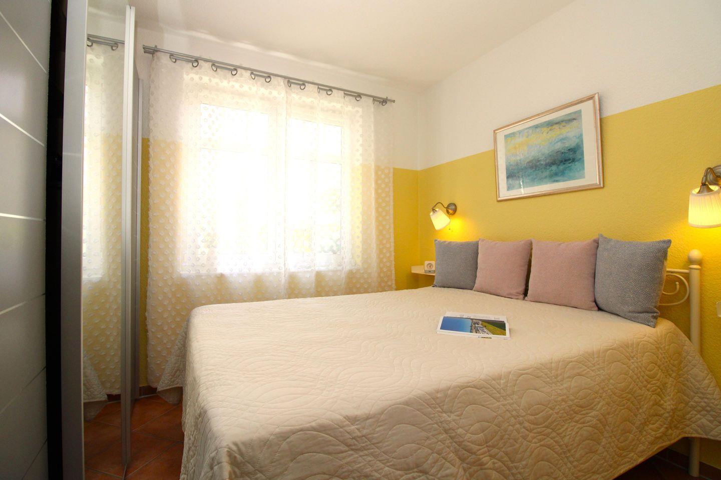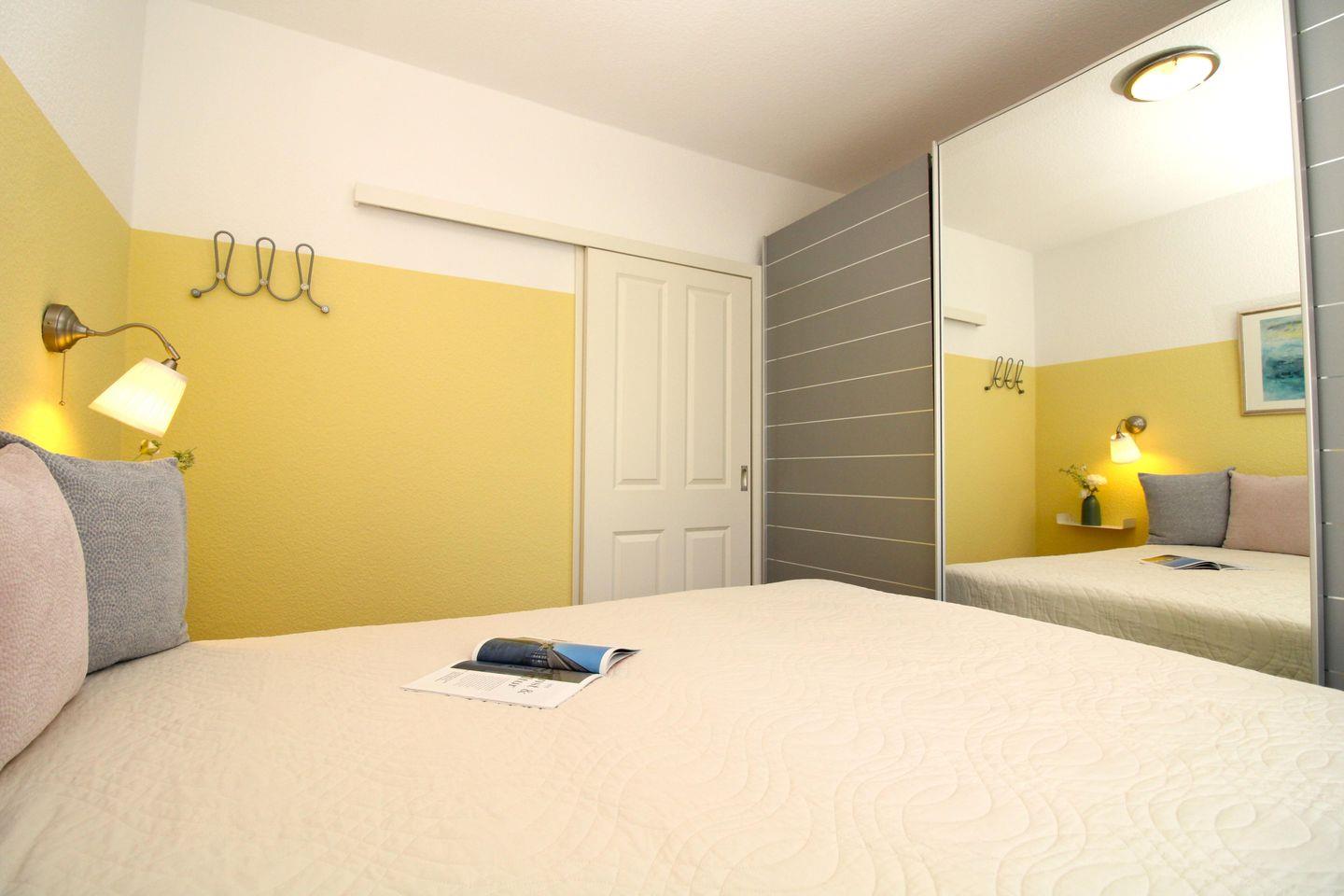 Das freundliche Schlafzimmer ist mit einem bequemen Doppelbett, Nachttischen sowie einem geräumigen Kleiderschrank eingerichtet.