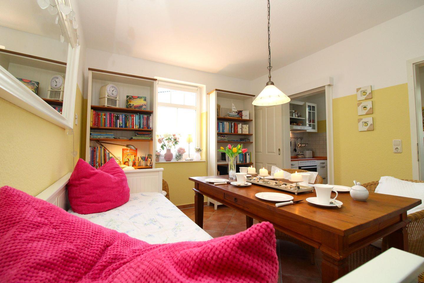Das großzügige Wohnzimmer verfügt über eine gemütliche Sitzgruppe mit 2 bequemen und ausziehbaren (Schlaf-)Couchen und Couchtisch, ein Sideboard, 2 Schränke / Glasvitrinen sowie einen Schreibtisch mit Korbsessel. Vom Wohnzimmer aus haben Sie direkten Zugang zu der ca. 16m² großen und zum Stadtwald gelegenen Terrasse (nach Westen ausgerichtet) mit Terrassenmöbeln, Strandkorb und Kohlegrill. Hier sitzen Sie entspannt und gemütlich im Grünen und können abends bei einem guten Glas Wein in Ruhe die lauen Sommernächte genießen!