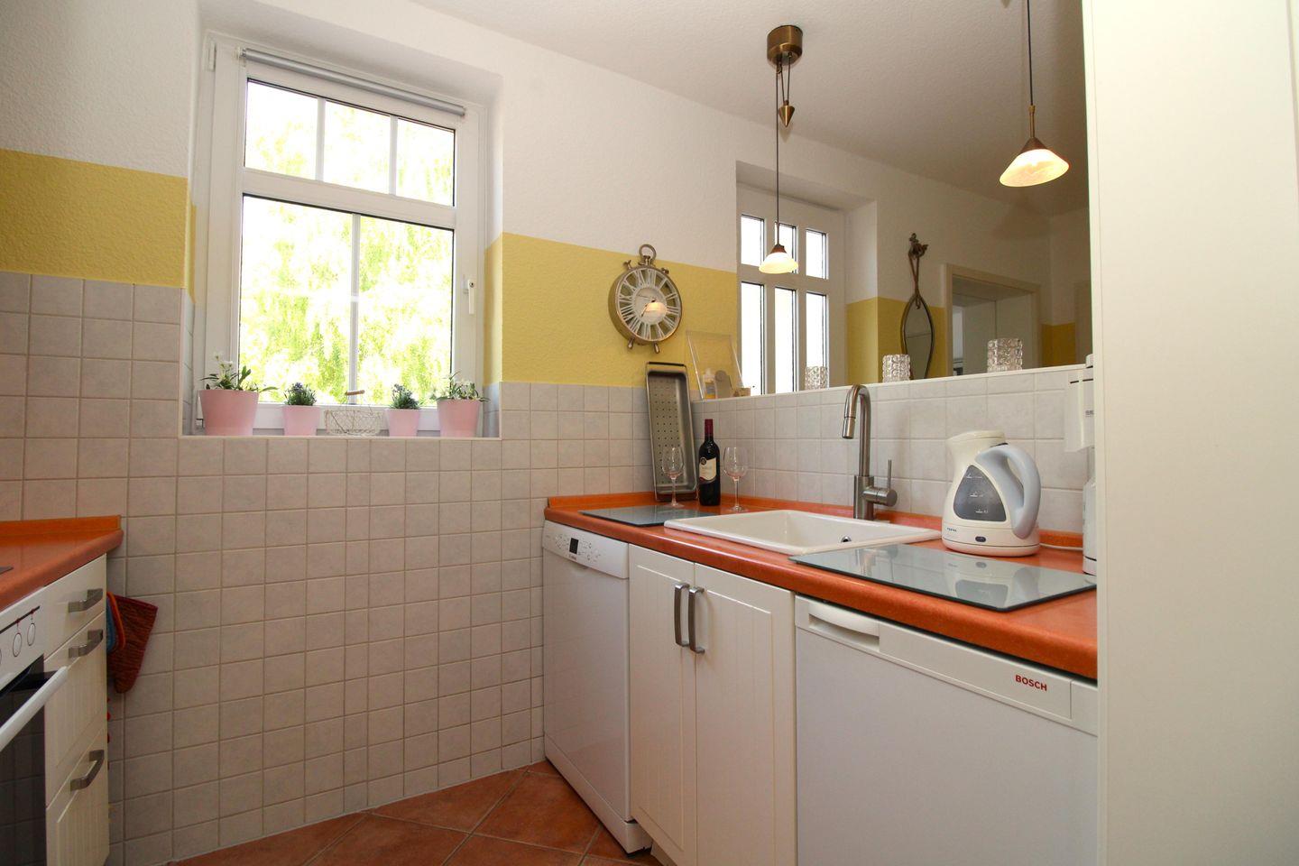 Die separate und halb offene Küche beinhaltet eine voll ausgestattete Einbauküchenzeile mit 4-Platten-Ceran-Kochfeld, Backofen, Dunstabzug, Geschirrspülmaschine, Kühlschrank mit Gefrierfach, Kaffeemaschine, Wasserkocher und Toaster. Die Küche ist mit Geschirr, Gläsern, Besteck und Töpfen bestens und vollständig ausgestattet.