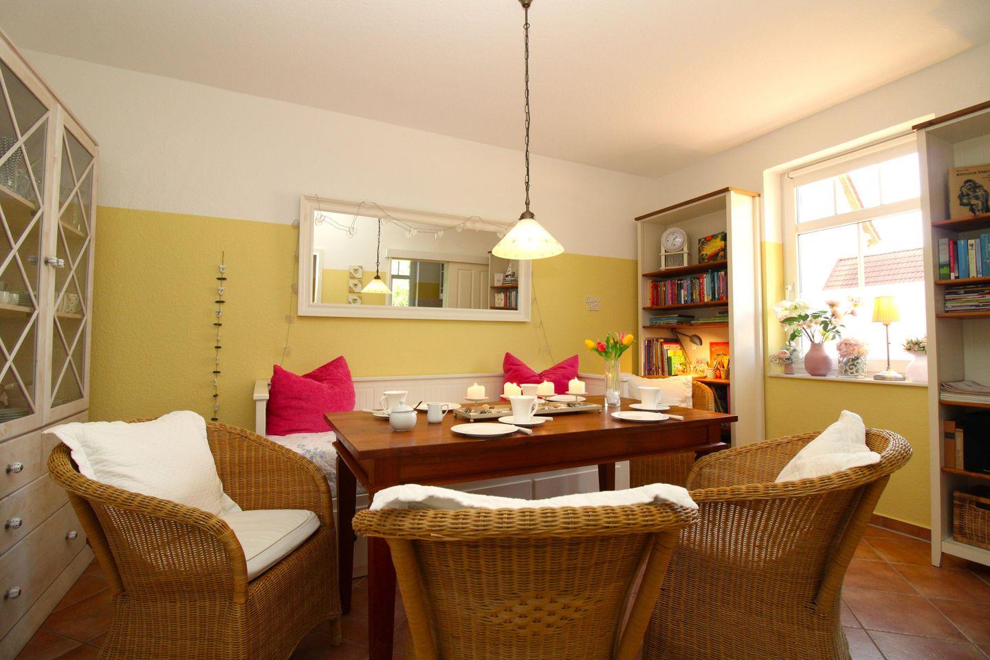 Neben der Küche befindet sich das gemütliche Esszimmer mit einem großen Esstisch, einem großen Sitz-Sofa, 4 bequemen Korbsesseln, einer geräumigen Vitrine mit Geschirr und Gläsern sowie 2 Regale mit Büchern und Musikanlage.