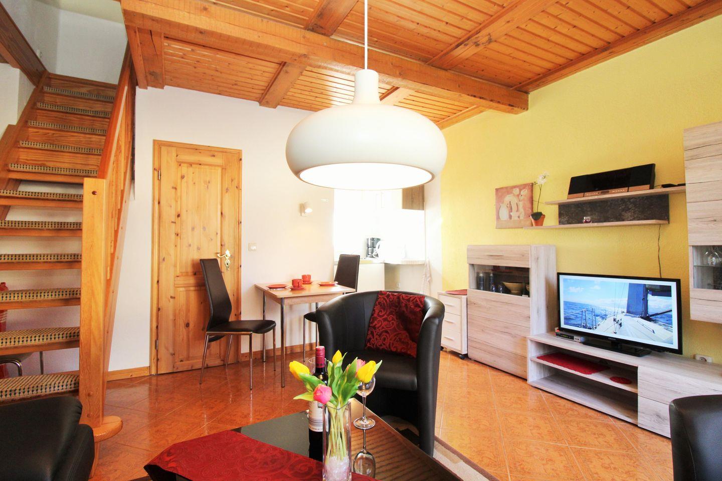 Die strandnahe und gemütliche 2-Zimmer-Wohnung (ca. 46 m²) im Erdgeschoss und 1. Obergeschoss (mit innen liegender Treppe) besitzt ein hohes Maß an Funktionalität und ist komplett eingerichtet. Der Bodenbelag im Schlafzimmer ist Holzlaminat, der Wohnbereich, die Küche und das Bad / WC sind gefliest.