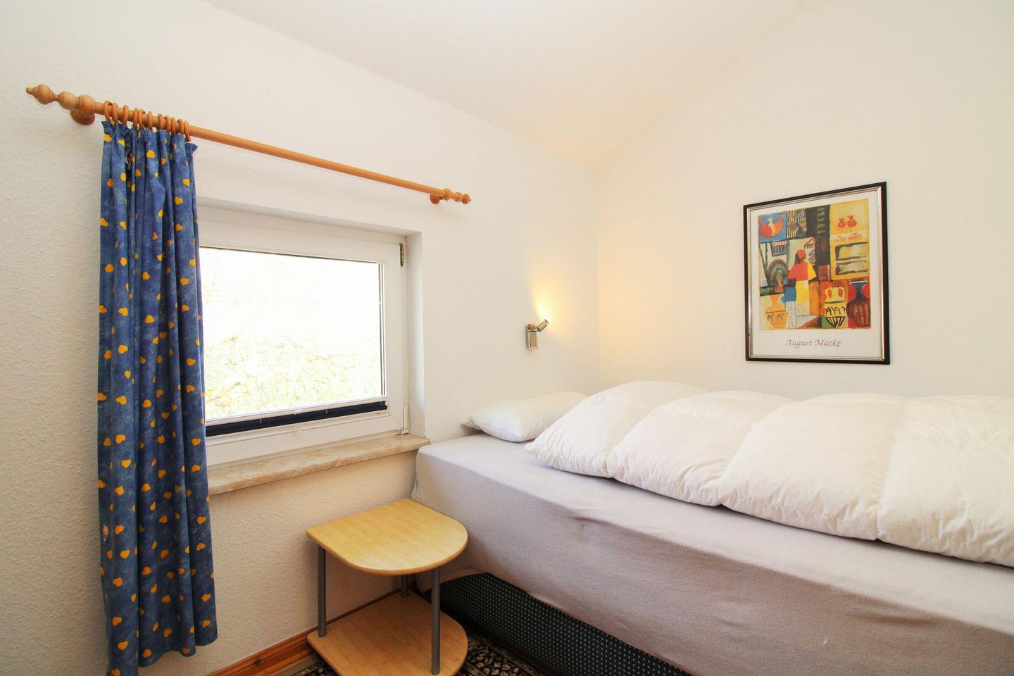 Das separate und zusätzliche 2. Schlafzimmer verfügt über ein bequemes Einzelbett mit Nachttisch und Lampe, einen geräumigen Kleiderschrank, ein Regal sowie einen Sessel.
