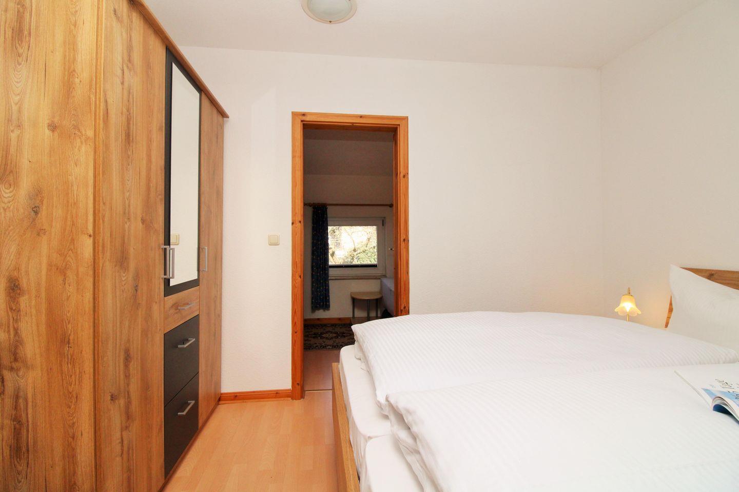 Das gemütliche 1. Schlafzimmer ist mit einem bequemen Doppelbett, Nachttischen mit Lampen sowie einem geräumigen Kleiderschrank eingerichtet.