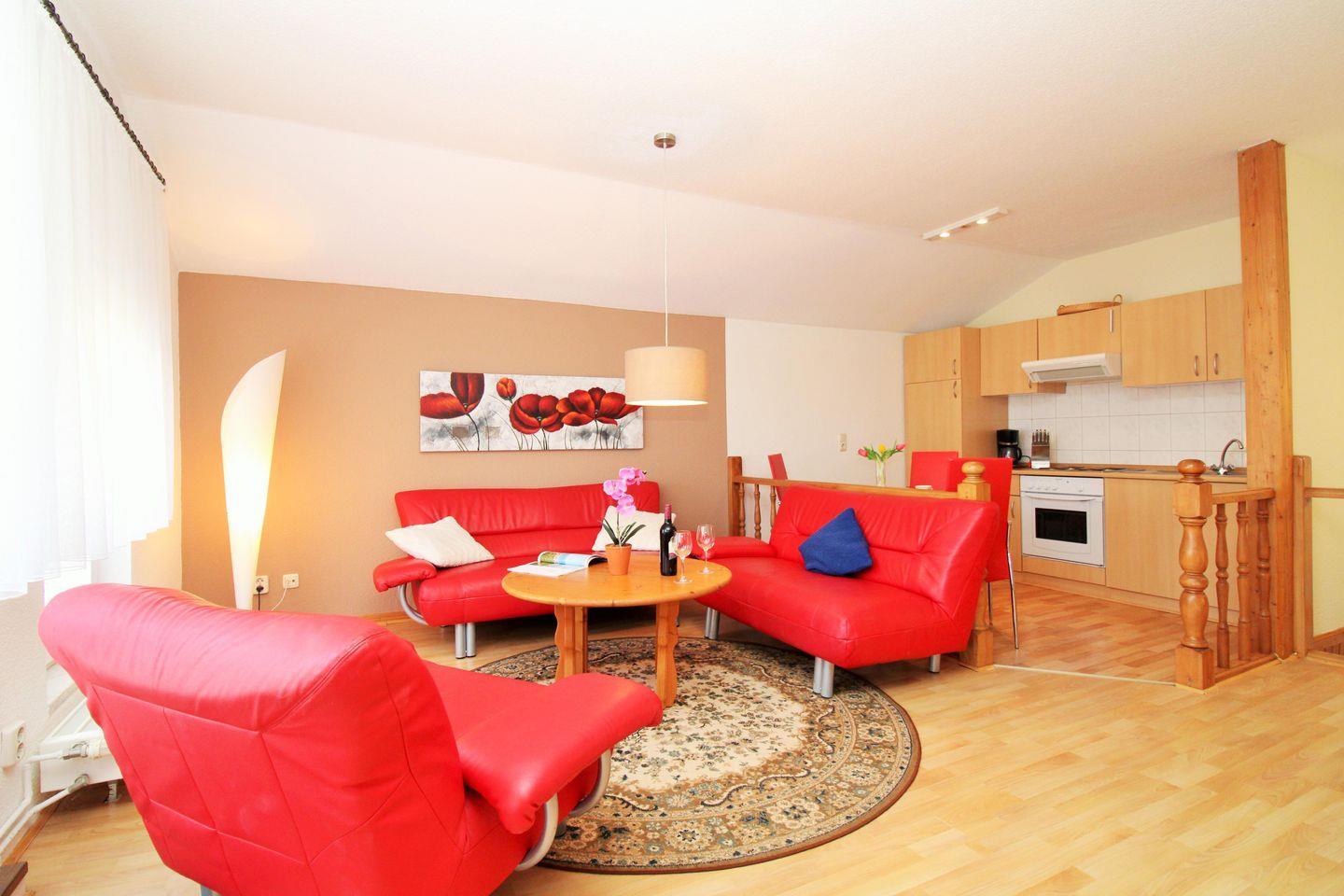 Das freundliche und großzügige Wohn-/Esszimmer verfügt über eine separate Sitzgruppe mit bequemer Couch, 2 Sesseln und Couchtisch, einen separaten Esstisch mit Stühlen sowie eine große Schrankwand. Vom Wohnzimmer aus haben Sie direkten Zugang zu dem großen Balkon (nach Westen ausgerichtet) mit Balkonmöbeln. Hier sitzen Sie entspannt und gemütlich im Grünen und können abends bei einem guten Glas Wein in Ruhe die lauen Sommernächte genießen!