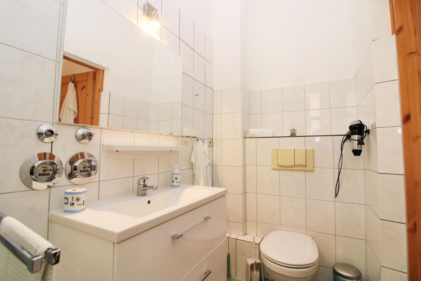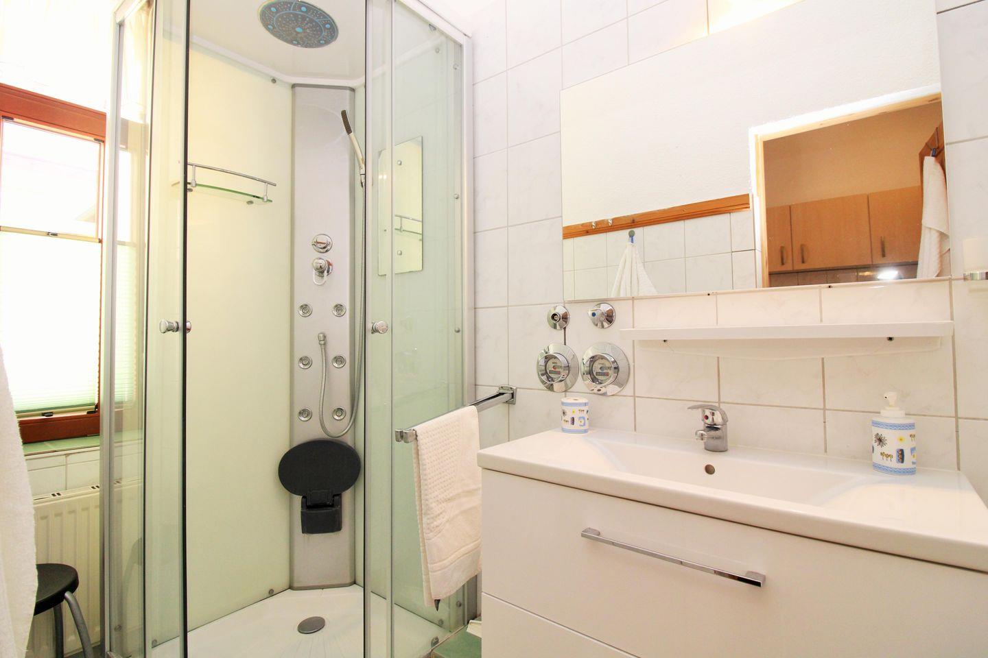 Das Badezimmer (mit Tageslicht / Fenster) verfügt über eine Dusche mit niedrigem Einstieg, Waschbecken mit Unterschrank, Föhn sowie WC.