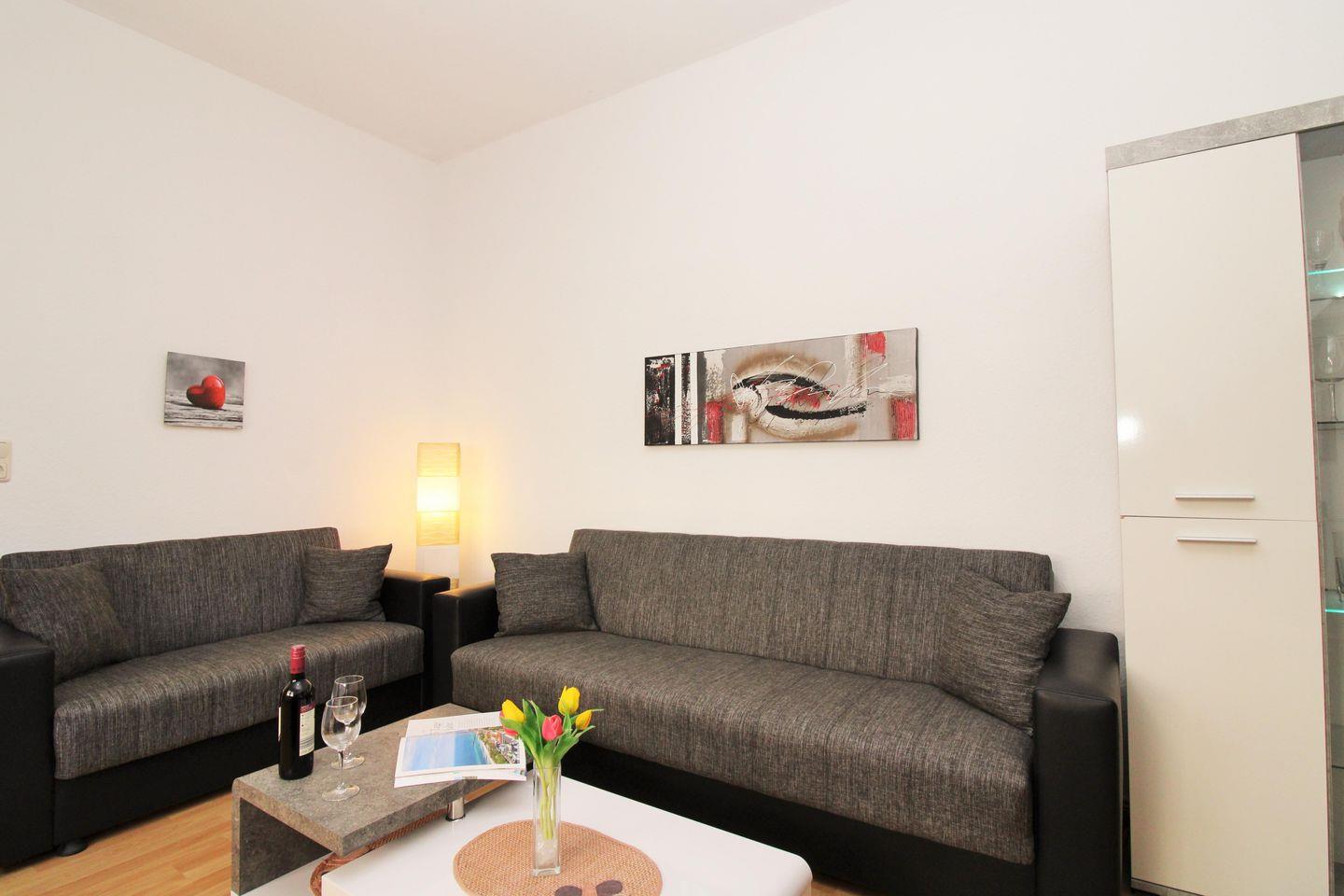 Die strandnahe und geräumige 2 ½-Zimmer-Wohnung (ca. 68 m²) im Erdgeschoss besitzt ein hohes Maß an Funktionalität und ist komplett eingerichtet. Der Bodenbelag im Wohnbereich ist Holzlaminat, die Küche sowie das Bad / WC sind gefliest.