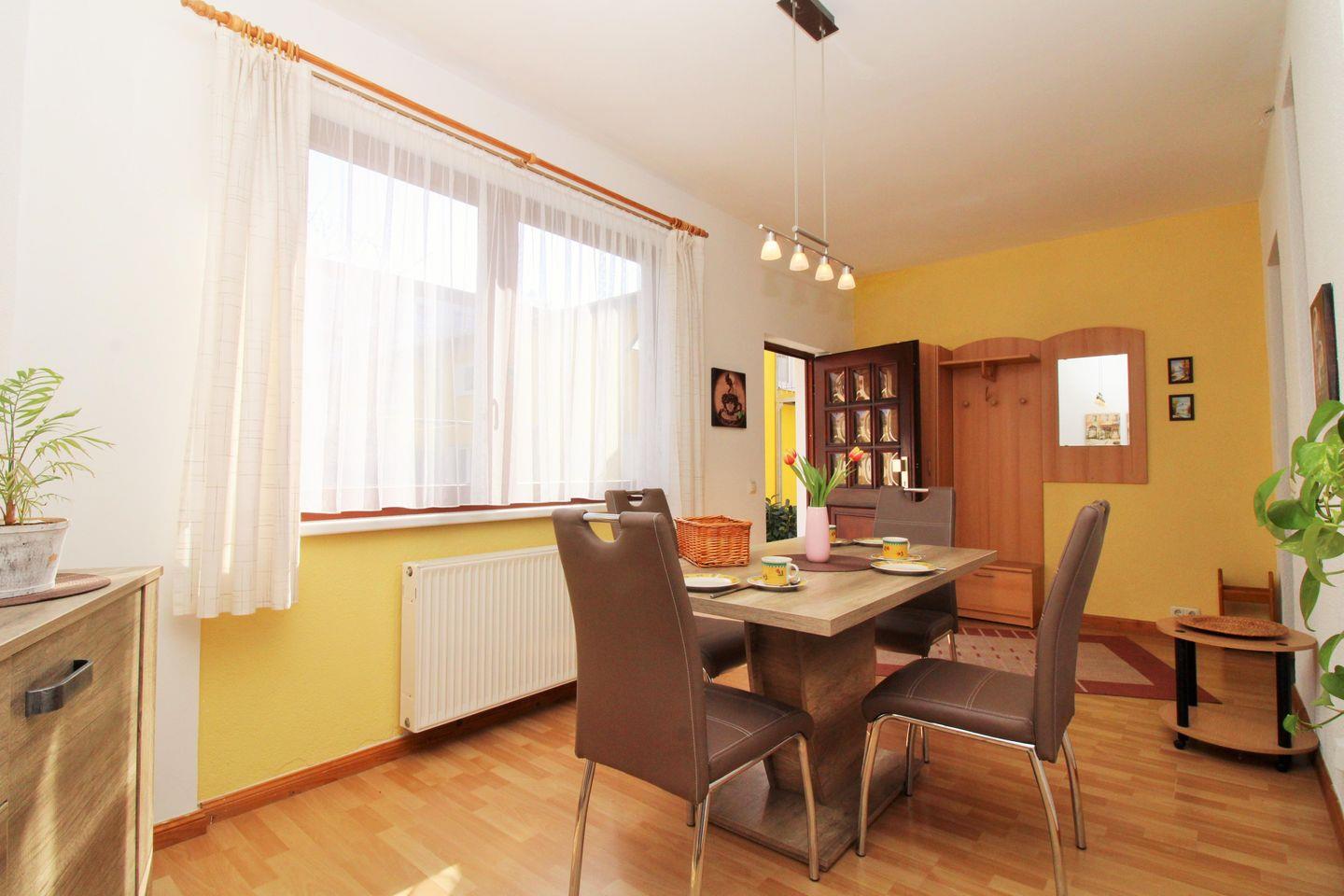 Der freundliche und großzügige Wohn-/Essbereich verfügt über eine separate Sitzgruppe mit 2 bequemen Couchen, Sessel und Couchtisch sowie verschiedene Schränke und Regale. Der räumlich getrennte Essbereich verfügt über einen separaten Esstisch mit 4 Stühlen sowie ein großes Sideboard. Vom Essbereich aus haben Sie direkten Zugang zur Terrasse (nach Osten ausgerichtet) mit Gartenmöbeln. Hier sitzen Sie entspannt und gemütlich im Grünen und können abends bei einem guten Glas Wein in Ruhe die lauen Sommernächte genießen!