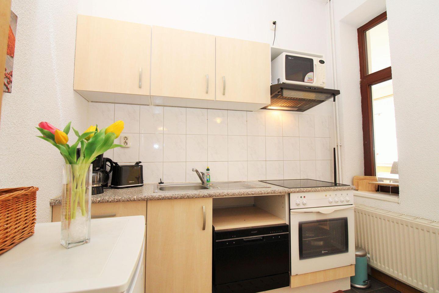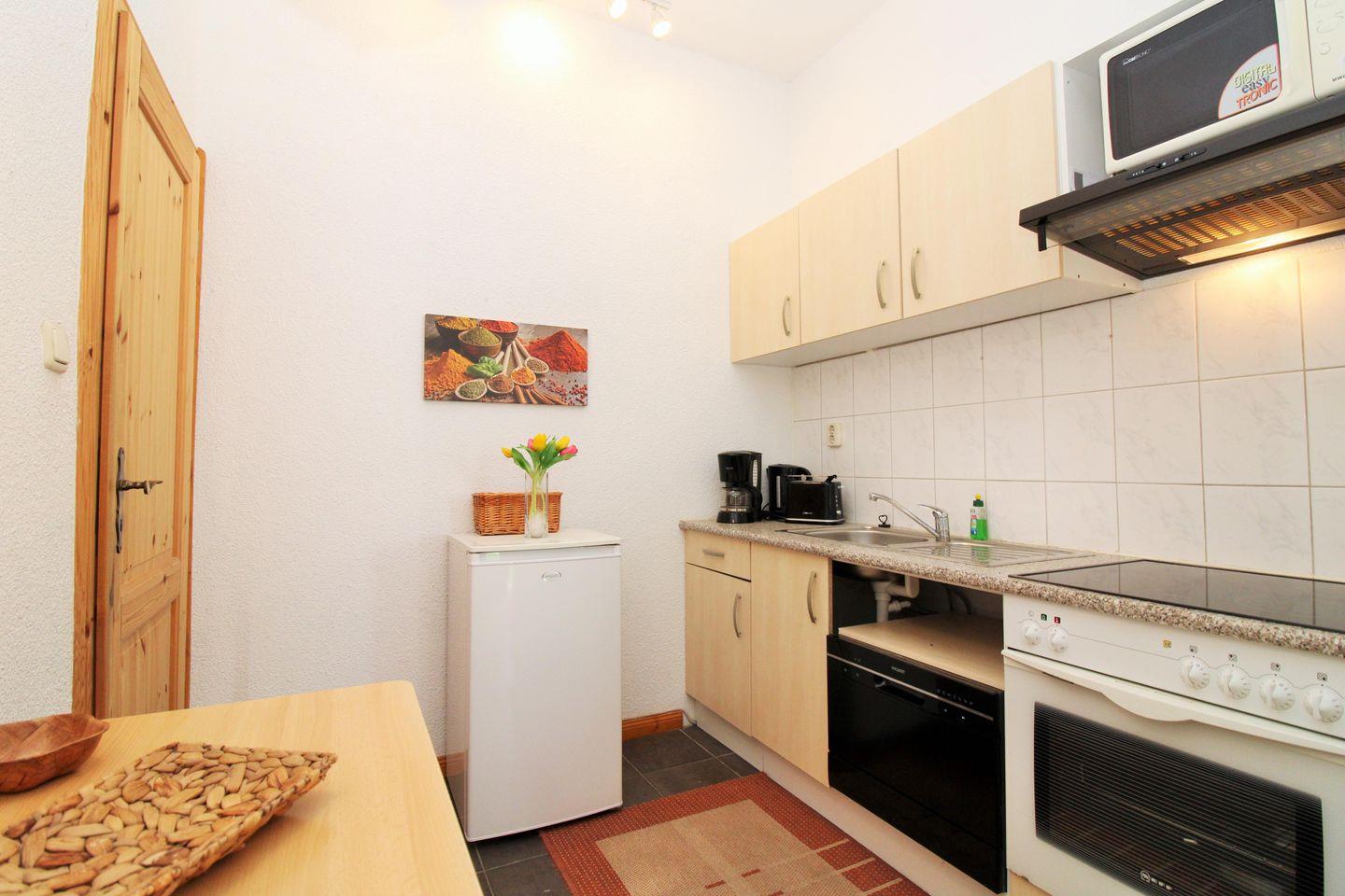 Die separate Küche beinhaltet eine Küchenzeile mit 4-Zonen-Ceran-Kochfeld, Backofen, Dunstabzug, Geschirrspüler, Kühlschrank mit Gefrierfach, Kaffeemaschine, Wasserkocher und Toaster. Die Küche ist mit Geschirr, Gläsern, Besteck und Töpfen komplett ausgestattet.