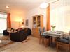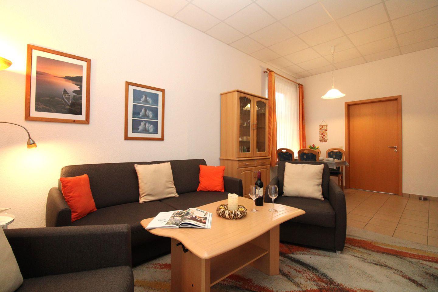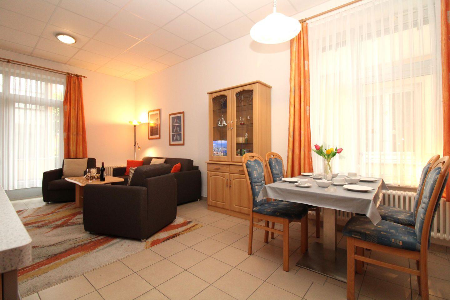 Das freundliche und gemütliche Wohn-/Esszimmer verfügt über eine separate Sitzgruppe mit bequemer (Schlaf-)Couch, 2 Sesseln und Couchtisch, einen separaten Esstisch mit 4 Stühlen sowie einen Wohnzimmerschrank mit Glasvitrine.