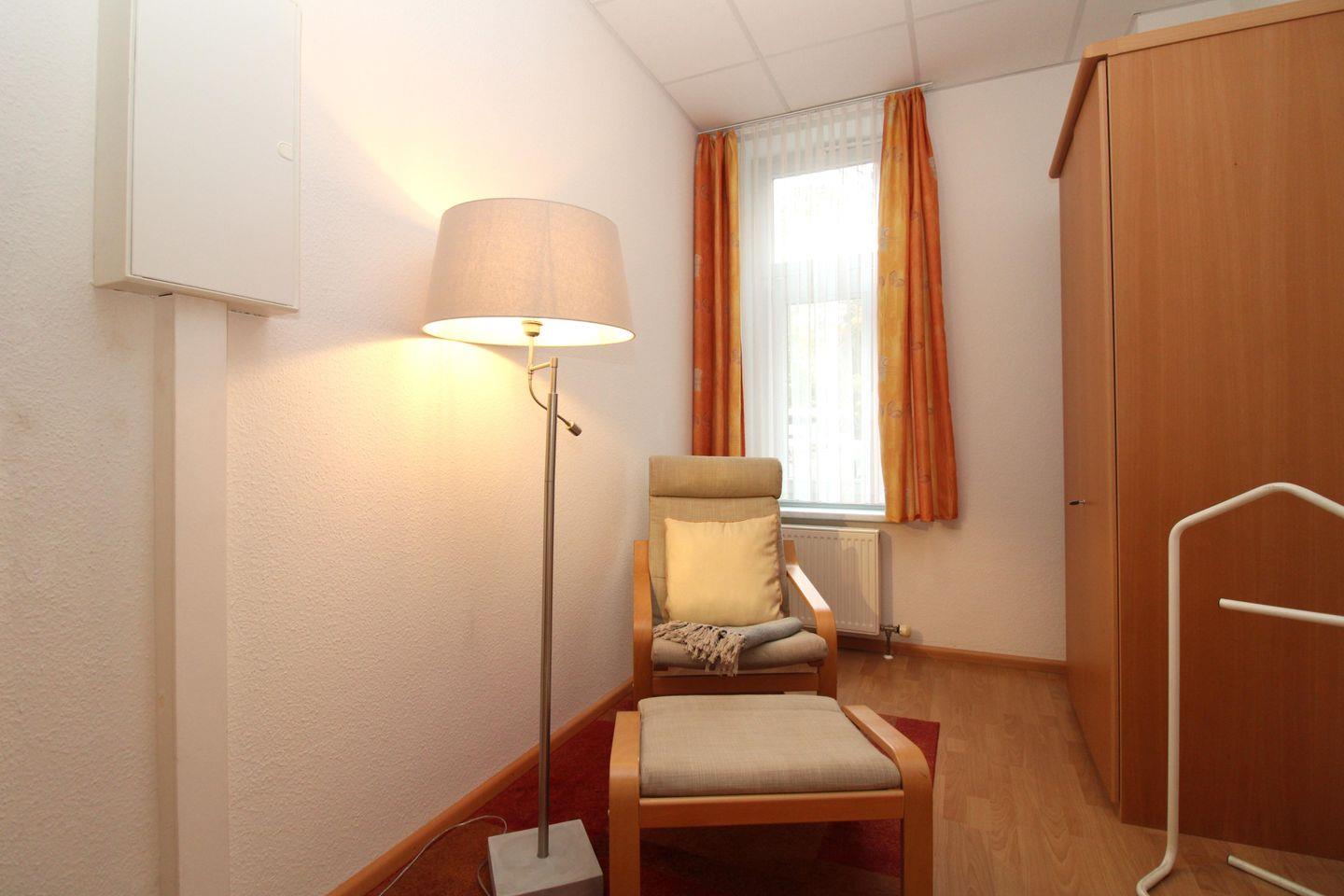 Das sehr geräumige Schlafzimmer ist mit einem bequemen Doppelbett (2 x 100 x 200 cm), Nachttischen, einem geräumigen Kleiderschrank, einer Kommode sowie einem bequemen Sessel mit Fußhocker eingerichtet.