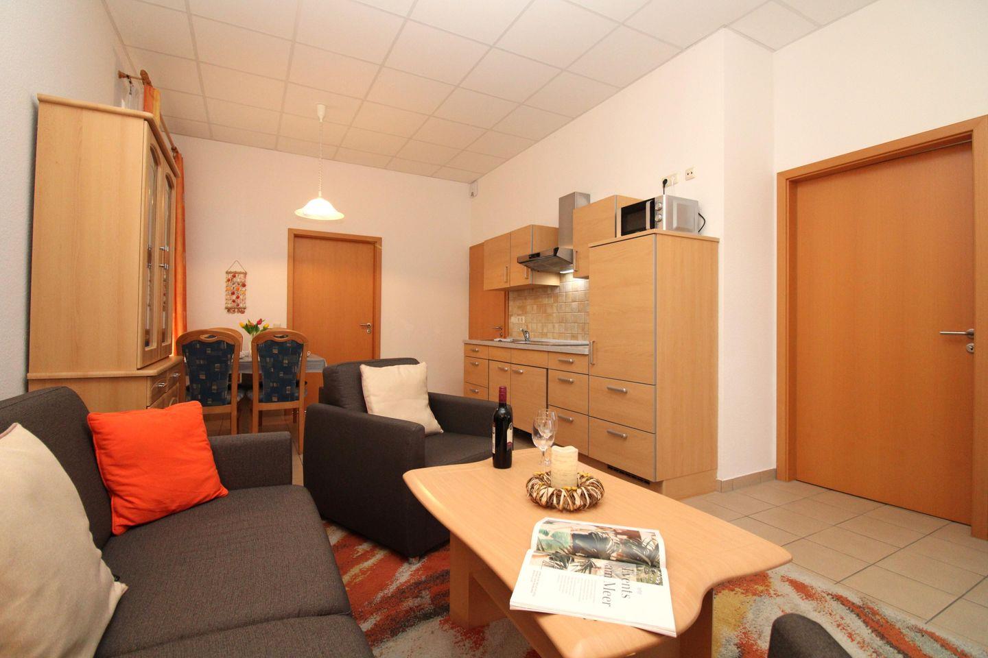 Die offene Küche beinhaltet eine voll ausgestattete Einbauküchenzeile mit 4-Zonen-Ceran-Kochfeld, Dunstabzug, Minibackofen, Mikrowelle, Kühlschrank, Kaffeemaschine, Wasserkocher und Toaster. Die Küche ist mit Geschirr, Gläsern, Besteck und Töpfen komplett ausgestattet. Bei geöffneten Türen unter der Spüle ist diese auch für Rollstuhlfahrer unterfahrbar.
