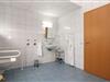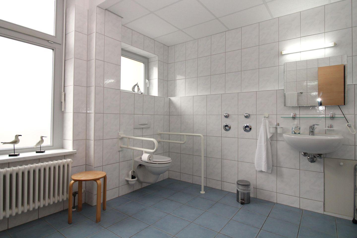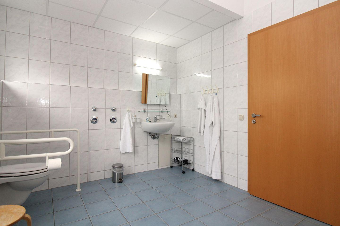 Ein fest in der Dusche integrierter Duschstuhl steht ebenfalls zur Verfügung. Das Waschbecken ist für Rollstuhlfahrer unterfahrbar, der Winkel des Wandspiegels ist verstellbar, damit sowohl sitzende als auch stehende Personen sich gut sehen können. Neben der Toilette befindet sich ein fest integrierter Haltegriff, auf der gegenüberliegenden Seite befindet sich ein klappbarer Griff.